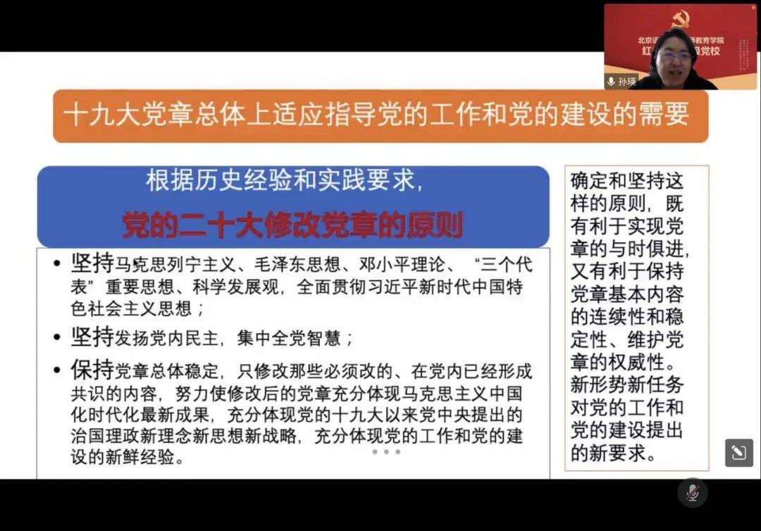 孙瑛老师聚焦新修订党章,从党的二十大修改党章的必要性和基本考虑,党的纲领和章程具体内容,带头尊崇党章、学习党章、遵守党章、贯彻党章、维护党章三方面领学。她指出,党章的修改是依据中国当前形势和任务的发展变化而做出的修改,是根据历史经验和实践要求做出的修改。修改党章是深入学习贯彻党的创新理论的需要,是推进党和国家事业发展的需要,是深入推进新时代党的建设新的伟大工程的需要。在党章中增写党百年奋斗的重大成就和历史经验的内容、增写新时代党的组织路线、增写自我革命这个跳出治乱兴衰历史周期律的第二个答案、增写党的两步走战略安排、全面推进中华民族伟大复兴的奋斗目标等内容,反映了党对客观实际和客观规律认识的深化,是对党实践经验的最新总结,体现了党的实践创新、理论创新、制度创新,能够在推进党的事业、加强党的建设中发挥重要的指导作用。