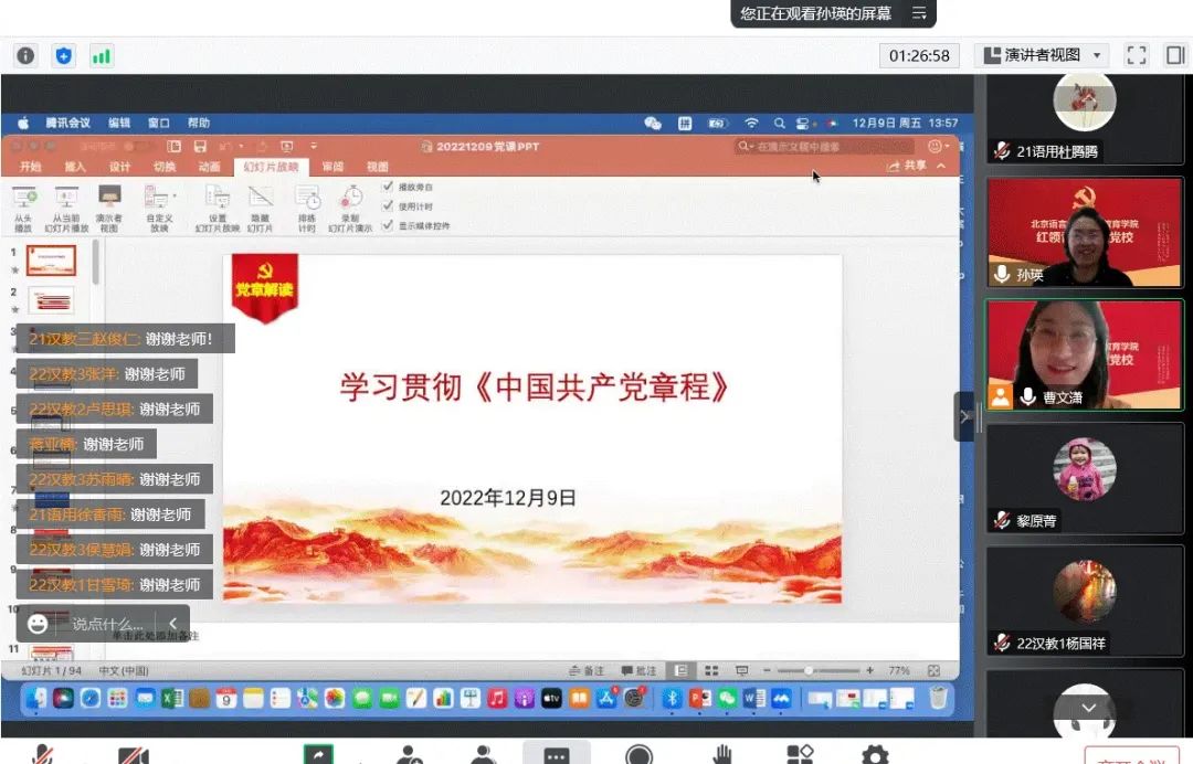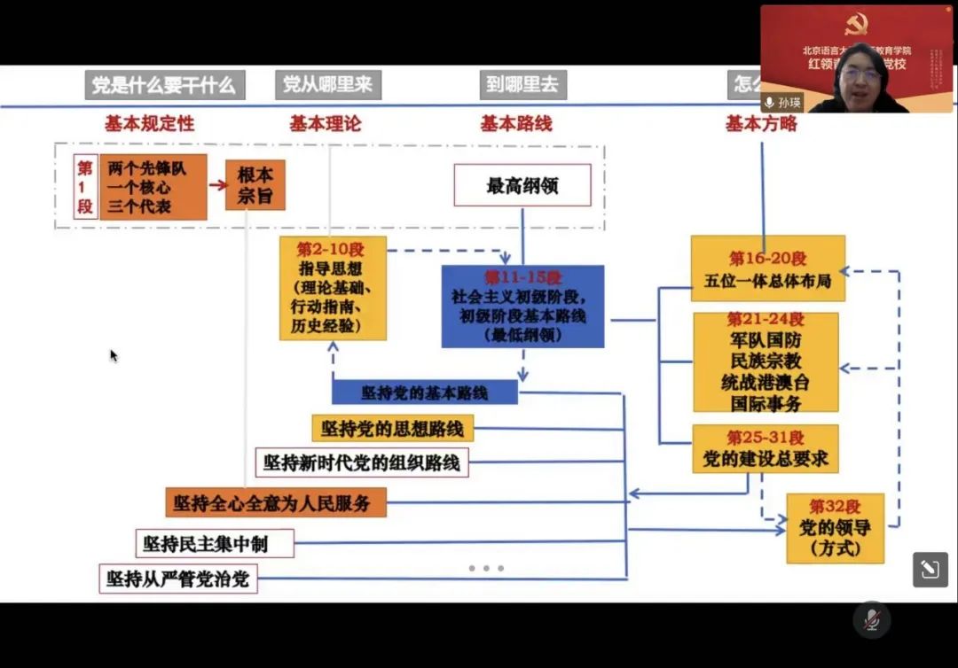 《中国共产党章程》是中国共产党为实现党的纲领、开展正规活动、规定党内事务所规定的根本法规,是党赖以建立和活动的法规体系的基础,是党的各级组织和全体党员必须遵守的基本准则和规定,具有最高党法、根本大法的效力。为提升我院师生党性修养,深化对党的理解,12月9日中午,北京语言大学教师教育学院“红领青年”初级党校(第一期)第三讲于线上顺利举行。本次活动由校党委组织部正处级组织员孙瑛老师做题为《学习贯彻<中国共产党章程>》的报告,学院本科生辅导员曹文潇主持,60余名学员列席会议,共同学习。