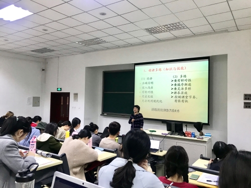精讲多练,在于培养学生对知识和技能的把握。精讲要将最核心的内容展现给学生,做到深入浅出,在教学中借助教学手段与技巧并利用现代化技术辅助与驱动,从而有针对性、启发性地进行讲解;多练要讲究循序渐进,控制课堂节奏,做到有张有弛。以学生为中心则要求教师应该尽量为每个学生提供尽可能多的主动学习的机会和资源条件,让学生能够积极主动地参与到学习活动中来,使学习这一行为具有生成性和创造性。此外,姜丽萍教授还指出要从语言技能、语言知识、文化能力与策略四个方面培养学生的语言综合运用能力,并培养学生渴望学习的兴趣从而提高课堂的有效性。在讲座过程中,姜丽萍教授用丰富的例子和生动的语言进行讲解,现场互动频繁,气氛活跃。