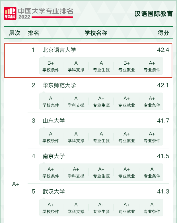 2022年6月18日,高等教育专业评价机构软科正式发布2022“软科中国大学专业排名”,北京语言大学教师教育学院汉语国际教育专业再获软科中国大学专业排名第一名。