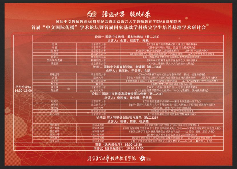 为庆祝国际中文教师教育60周年暨北京语言大学教师教育学院建院60周年,加快促进人才培养,切实提升拔尖基地班学生素质水平,10月20日下午,首届“中文国际传播”学术论坛暨首届国家基础学科拔尖学生培养基地学术研讨会在北京语言大学成功举办。此次会议围绕国际中文教师教育的多个核心议题,设立了四个平行分论坛,来自北京大学、华东师范大学、北京语言大学等多所国内高校的中外本、硕、博学生分享研究成果,并就国际中文教育的现状、挑战与未来发展方向展开深入讨论。