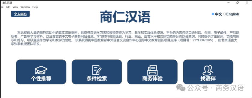 “智能化商务汉语实践体验平台”(应用程序产品名称为“商仁汉语”)包括商务汉语真实语料库、商务汉语知识库、商务实践体验资源库,商务汉语在线学习平台、互动交流平台,以及学习需求分析中心(简称“三库、二台、一中心”),用户通过电脑或手机客户端注册即可进入该平台使用各种功能。