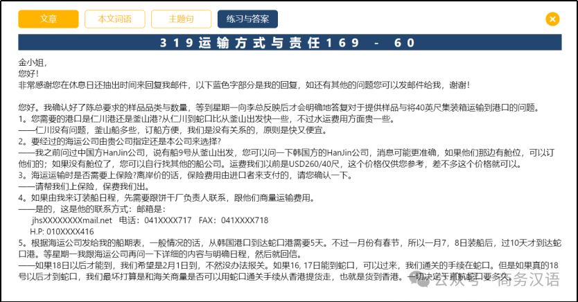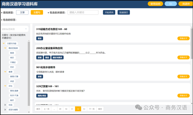 在线学习平台提供针对语料资源的学习指南,包括提取出与语料业务内容密切相关的术语及词汇、主题句,并提供例释、练习及答案。用户打开一篇语料后,可以查看该语料中的特殊词语和主题句,了解其意义和用法,并可在学习完语料后做练习,进行测验,以评估对语料的理解和掌握情况。每一篇语料的练习都配有答案可下载。用户也可通过检索业务内容、行业与职业、话题、体裁、难度、交际功能或关键词等条件,寻找自己感兴趣的语料或知识点进行学习或教学。同时,用户可在学习过程中随时进入互动交流平台“找语伴”,寻找一起学习或提供教学指导的人进行互动交流。