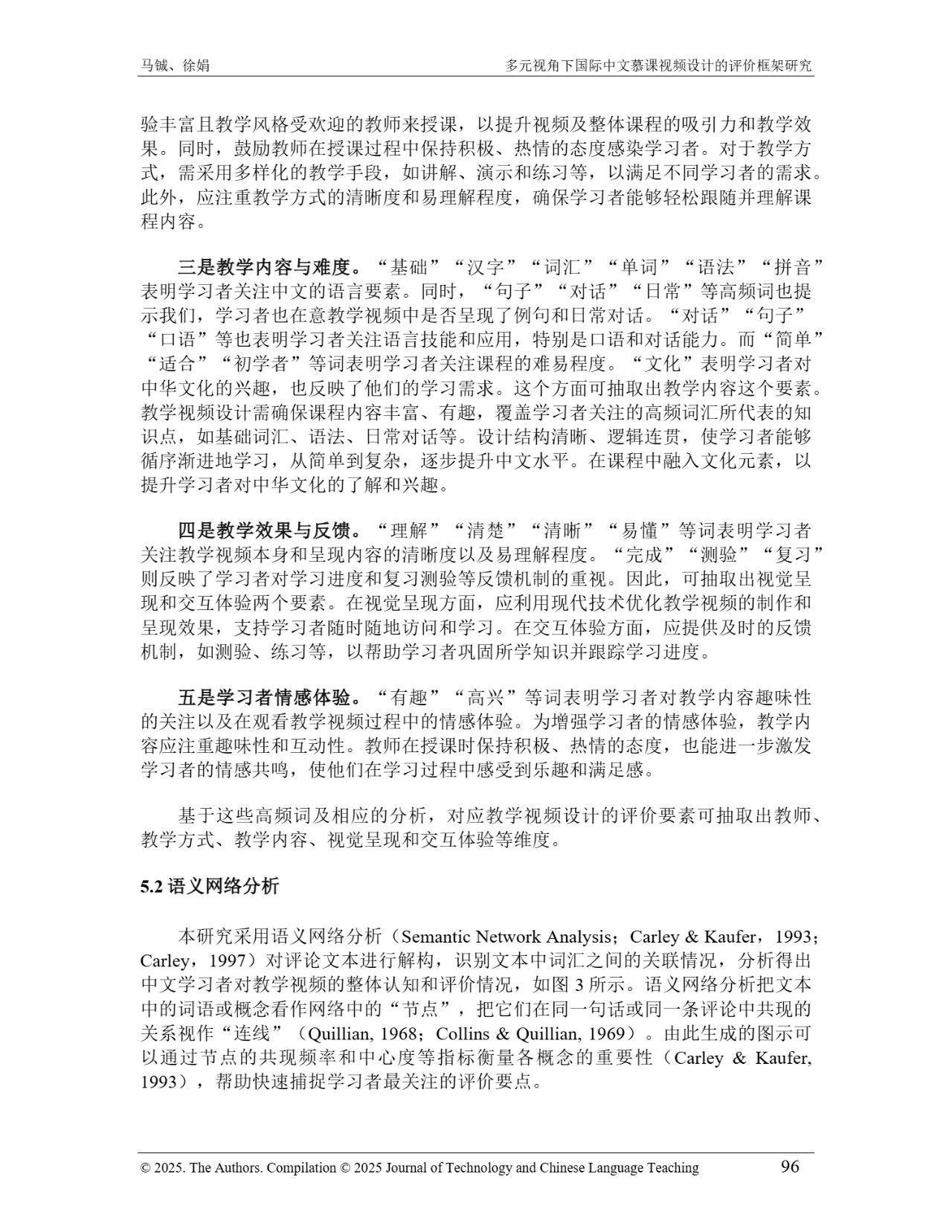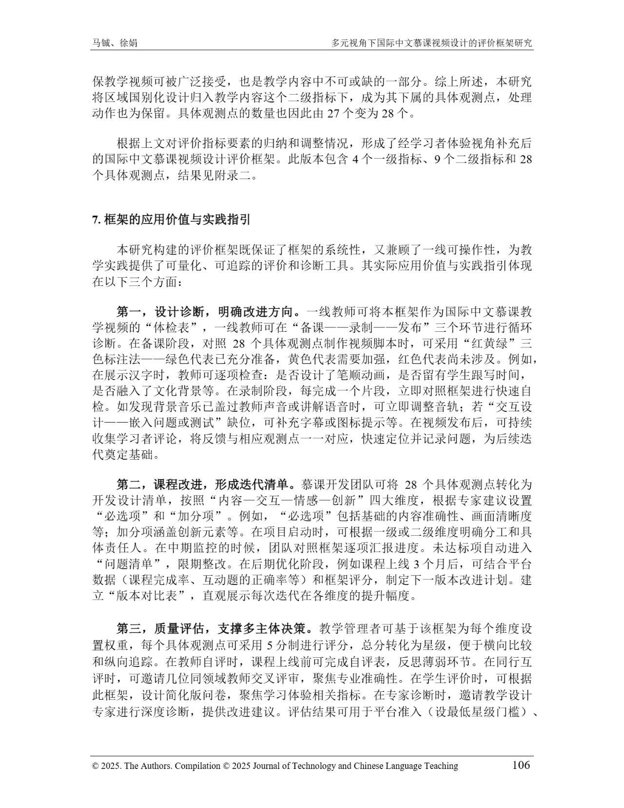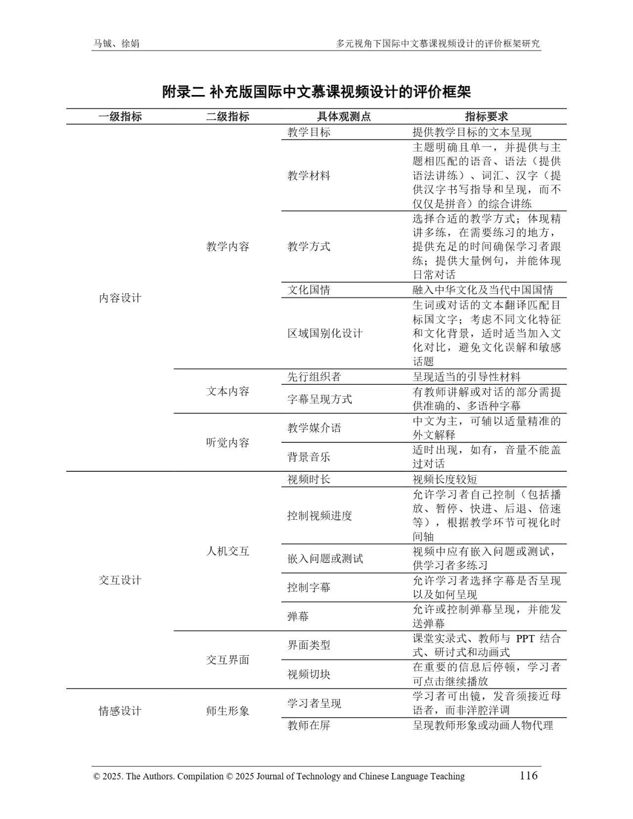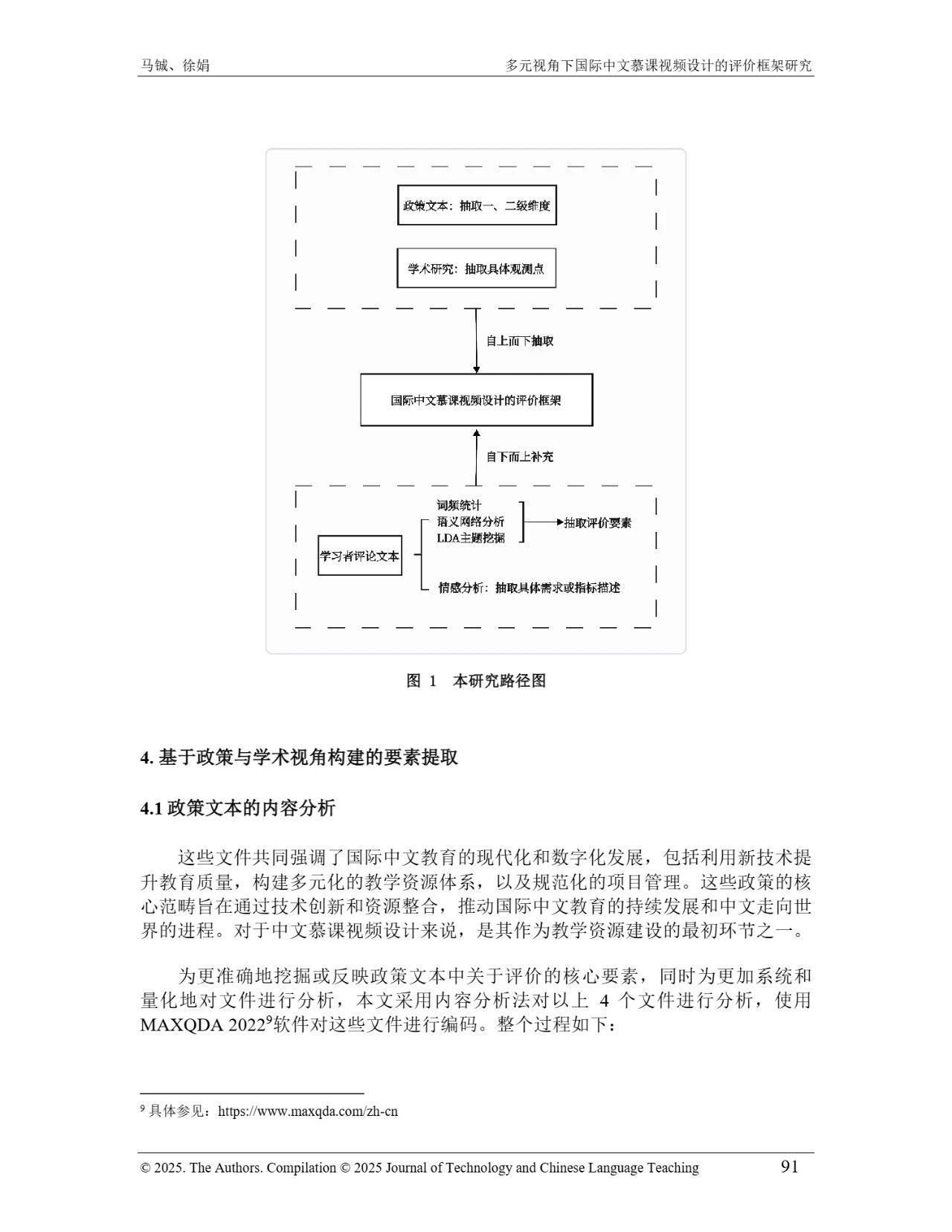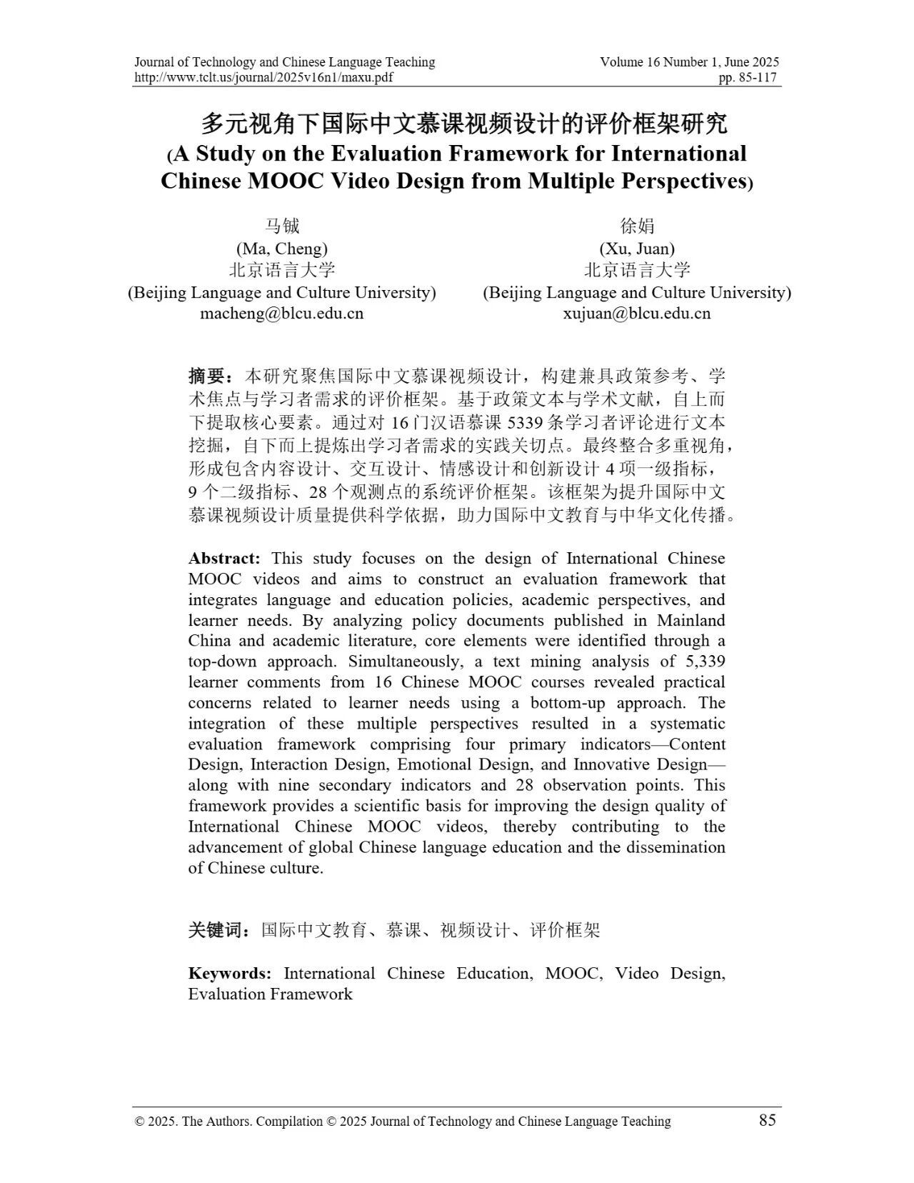 近日,我院教师马铖博士和信息科学学院徐娟研究员在Journal of Technology and Chinese Language Teaching 第16卷第1期中发表论文《多元视角下国际中文慕课视频设计的评价框架研究》。本研究聚焦国际中文慕课视频设计,构建兼政策参考、学术焦点与学习者需求的评价框架。基于政策文本和学术文献,自上而下提取核心要素;挖掘16门汉语慕课5339条学习者评论,自下而上提炼需求实践关切点。整合多重视角,形成含4项一级指标、9项二级指标、28个观测点的系统评价框架,为优化慕课视频设计、助力国际中文教育与中华文化传播提供学理依据 。