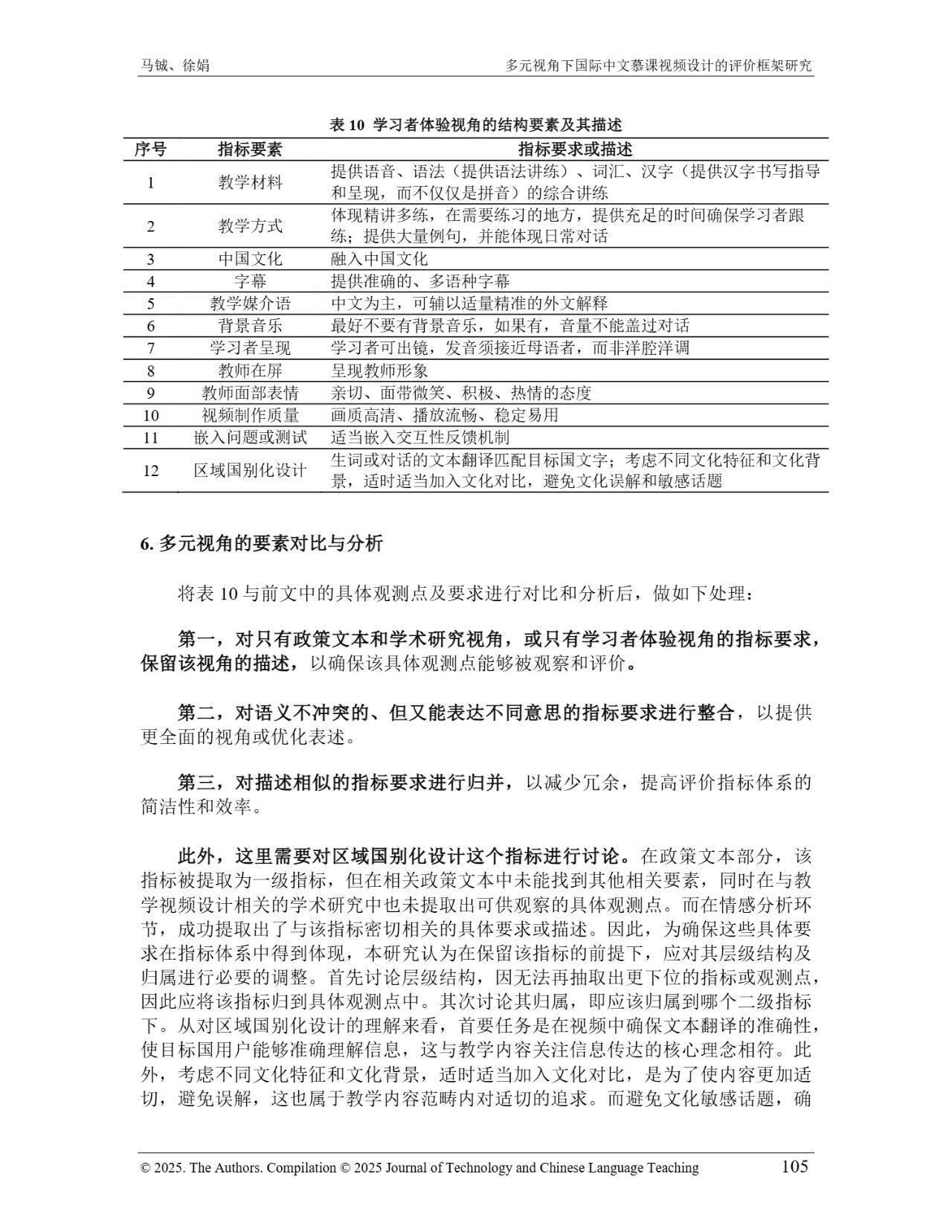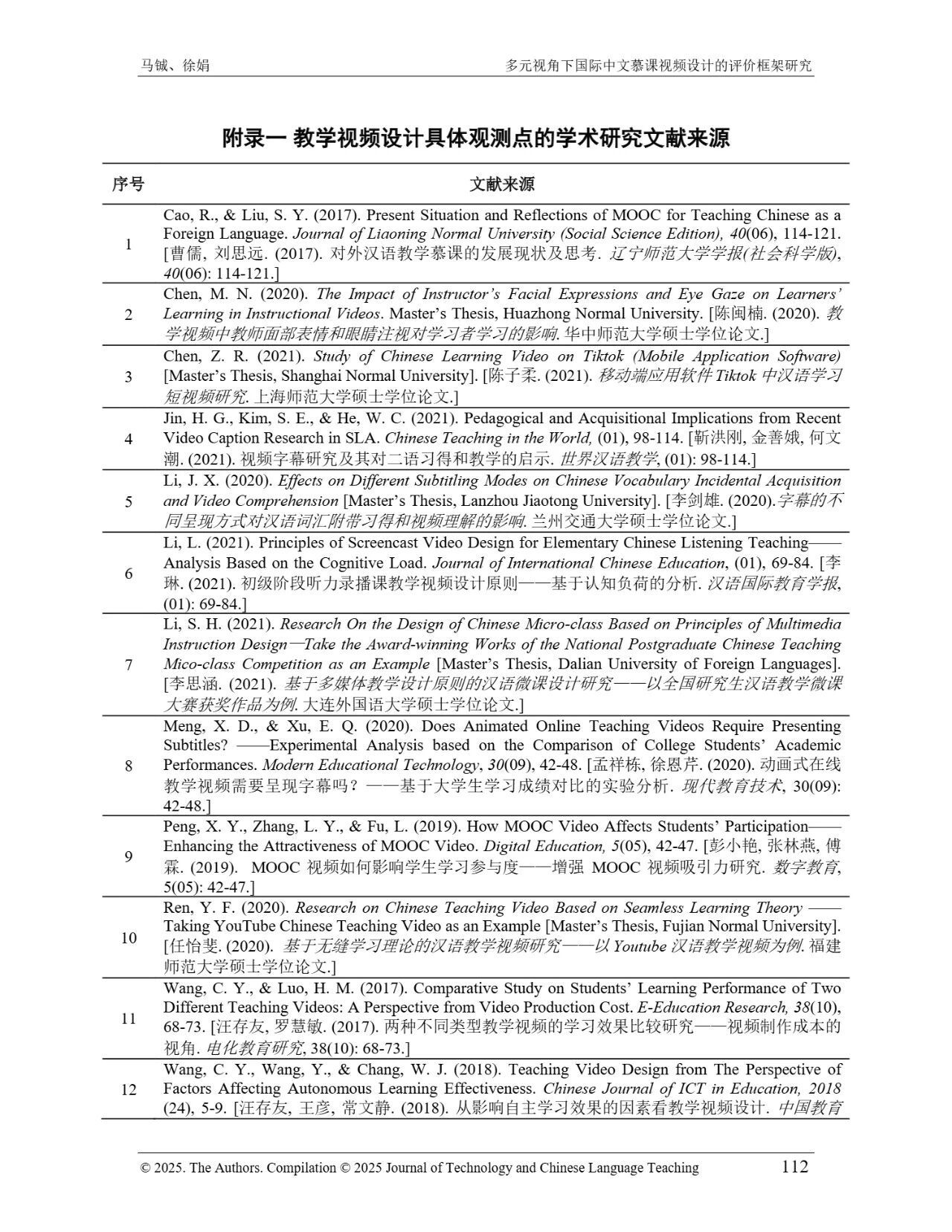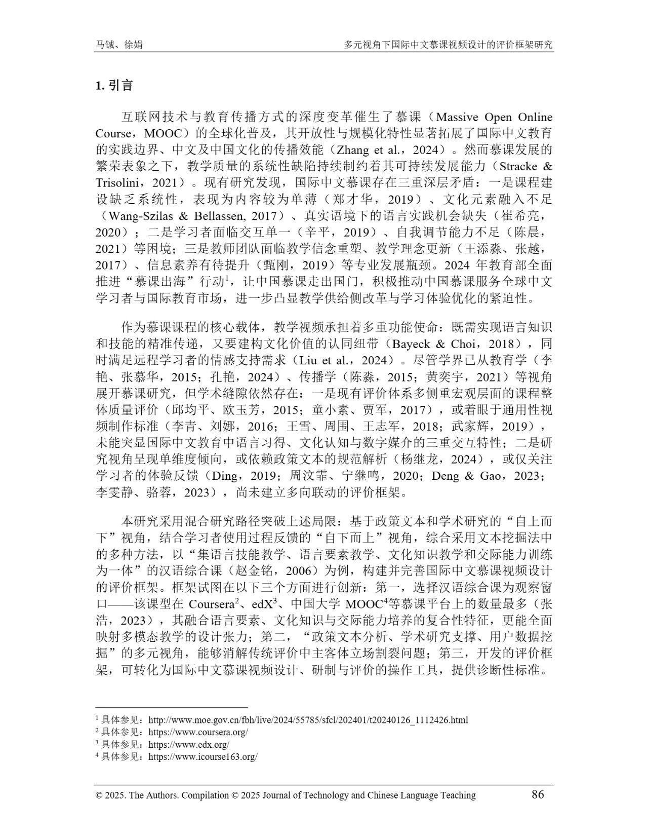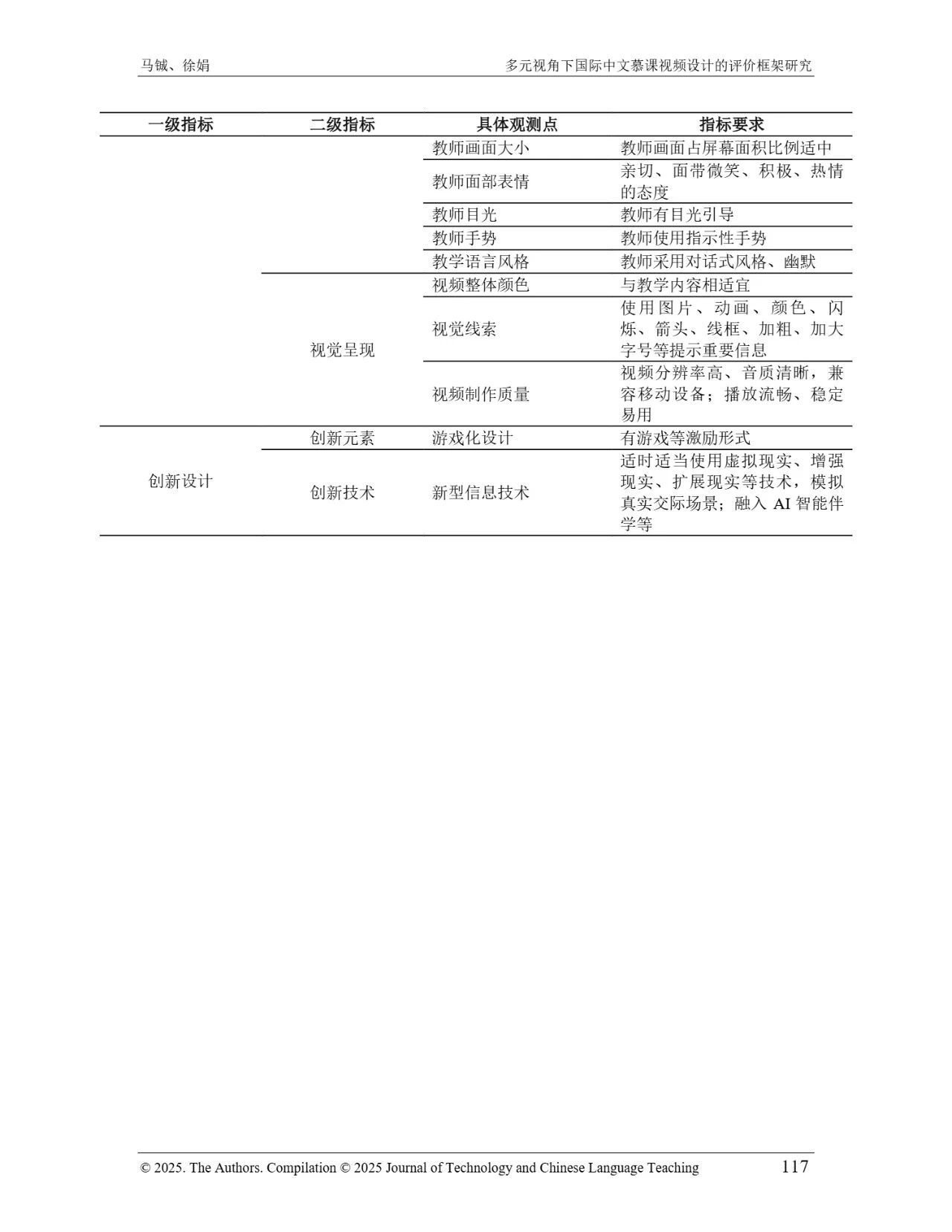 近日,我院教师马铖博士和信息科学学院徐娟研究员在Journal of Technology and Chinese Language Teaching 第16卷第1期中发表论文《多元视角下国际中文慕课视频设计的评价框架研究》。本研究聚焦国际中文慕课视频设计,构建兼政策参考、学术焦点与学习者需求的评价框架。基于政策文本和学术文献,自上而下提取核心要素;挖掘16门汉语慕课5339条学习者评论,自下而上提炼需求实践关切点。整合多重视角,形成含4项一级指标、9项二级指标、28个观测点的系统评价框架,为优化慕课视频设计、助力国际中文教育与中华文化传播提供学理依据 。