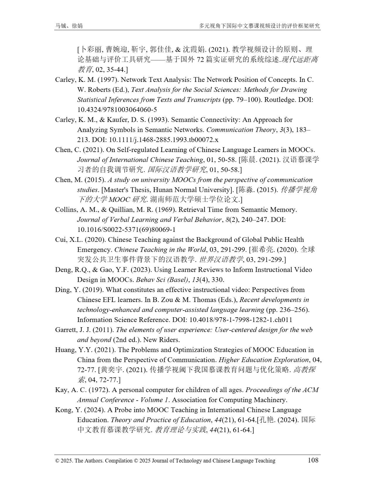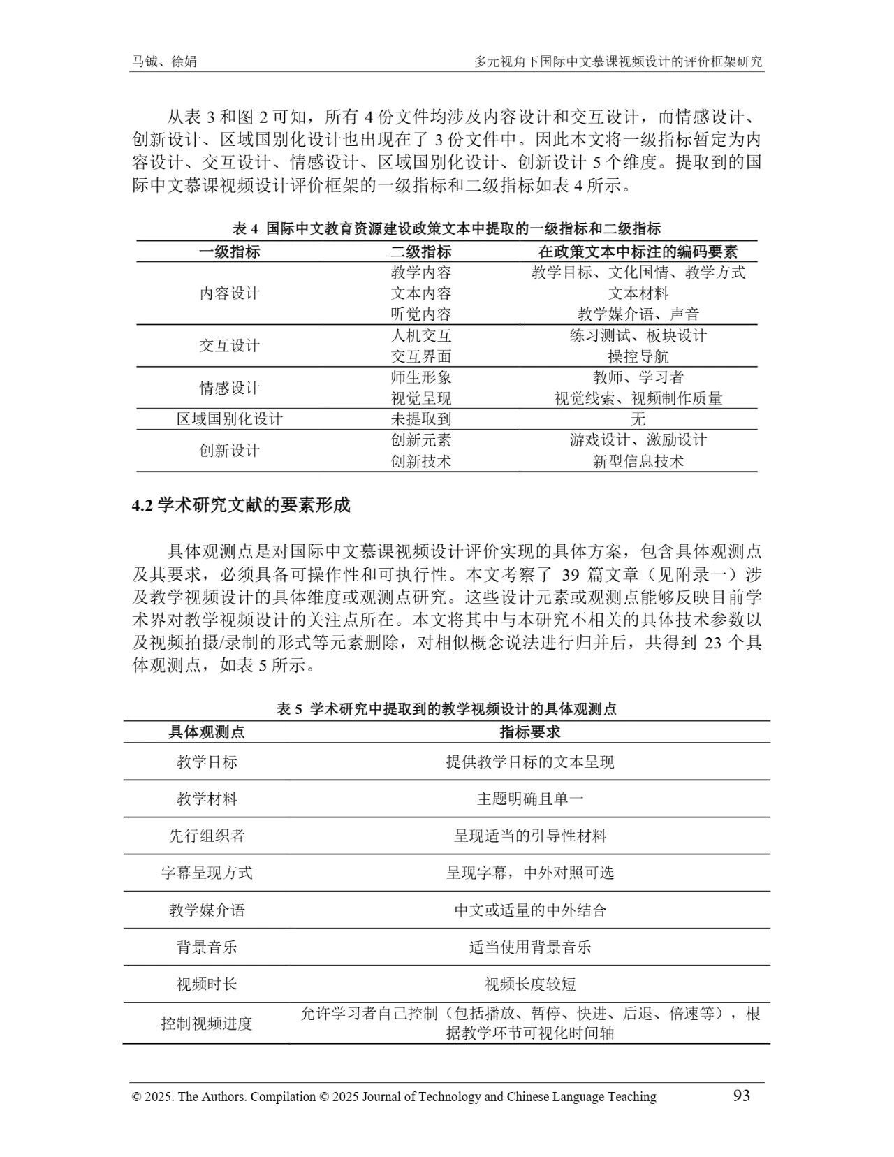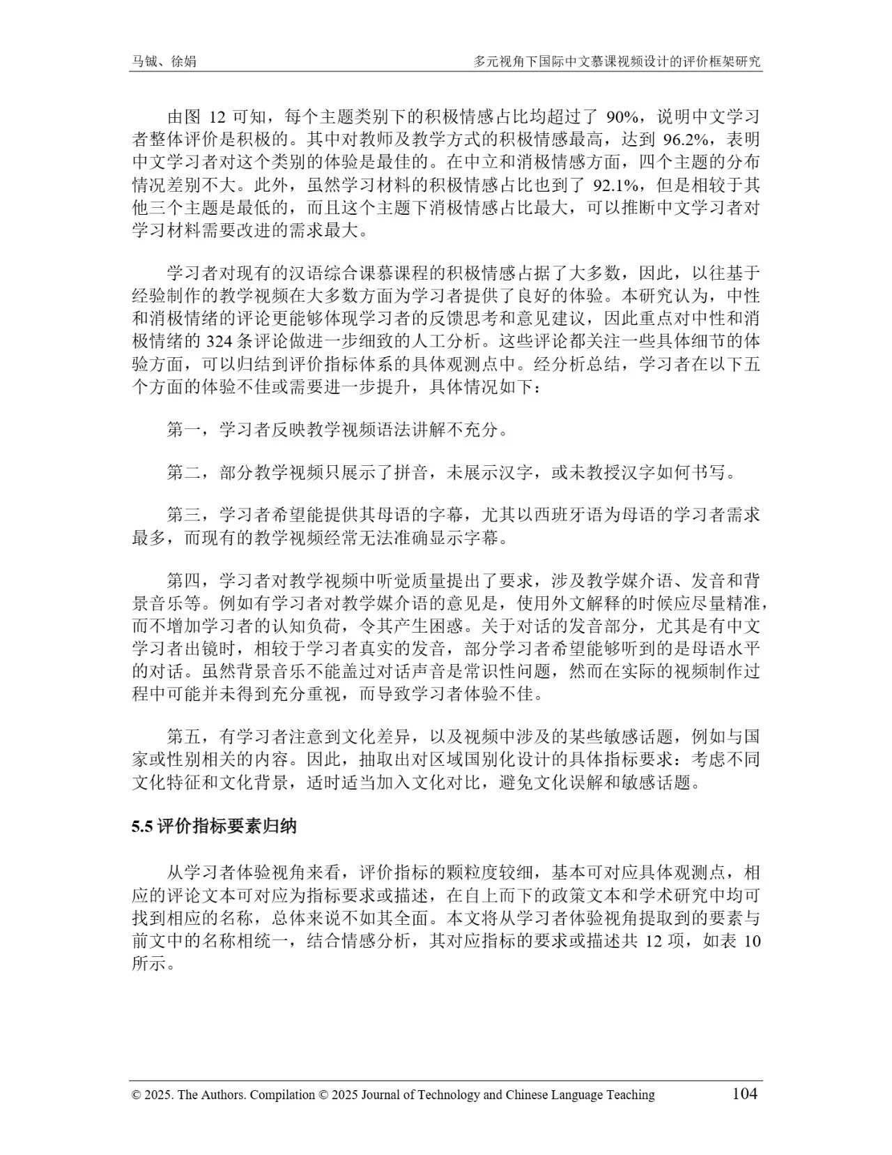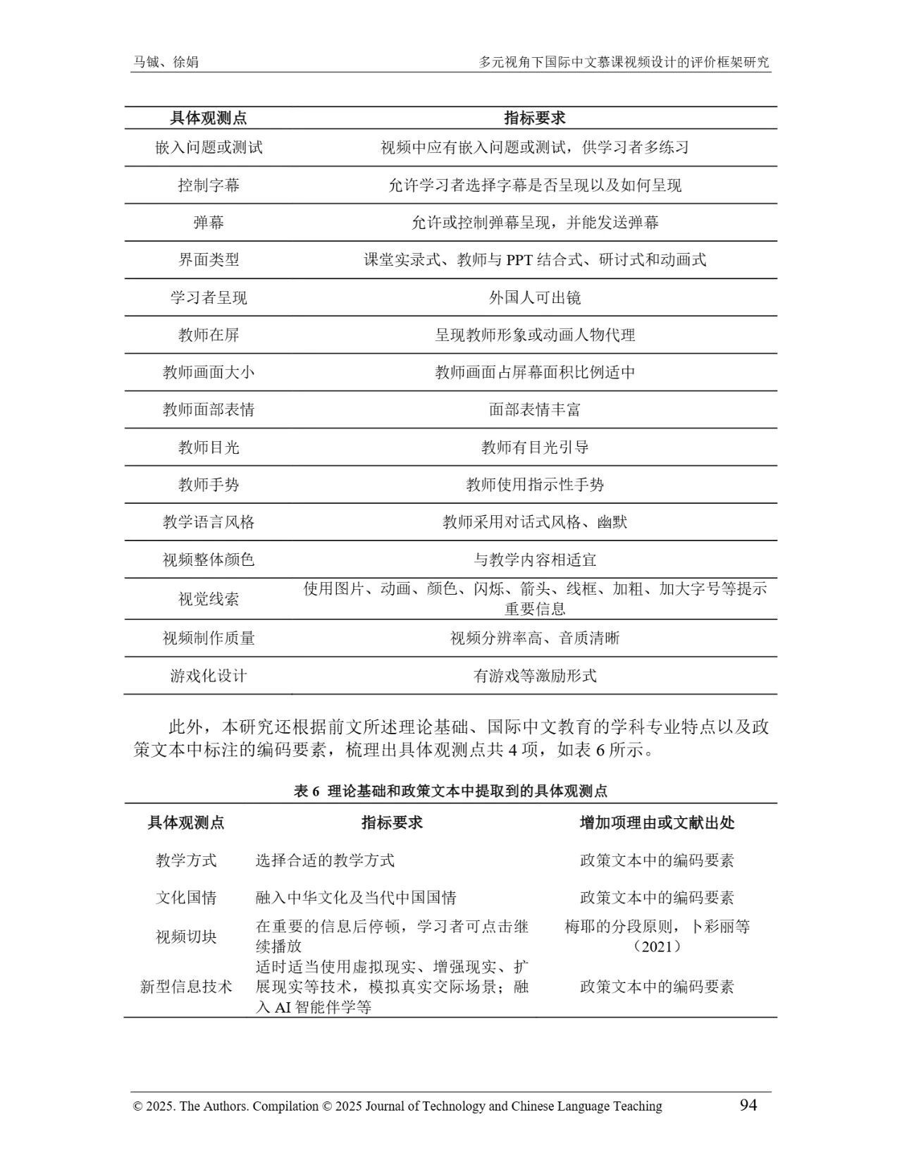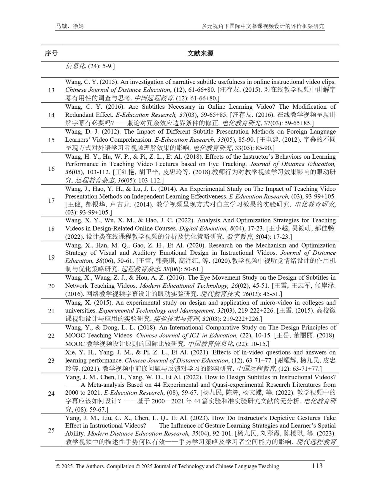 近日,我院教师马铖博士和信息科学学院徐娟研究员在Journal of Technology and Chinese Language Teaching 第16卷第1期中发表论文《多元视角下国际中文慕课视频设计的评价框架研究》。本研究聚焦国际中文慕课视频设计,构建兼政策参考、学术焦点与学习者需求的评价框架。基于政策文本和学术文献,自上而下提取核心要素;挖掘16门汉语慕课5339条学习者评论,自下而上提炼需求实践关切点。整合多重视角,形成含4项一级指标、9项二级指标、28个观测点的系统评价框架,为优化慕课视频设计、助力国际中文教育与中华文化传播提供学理依据 。