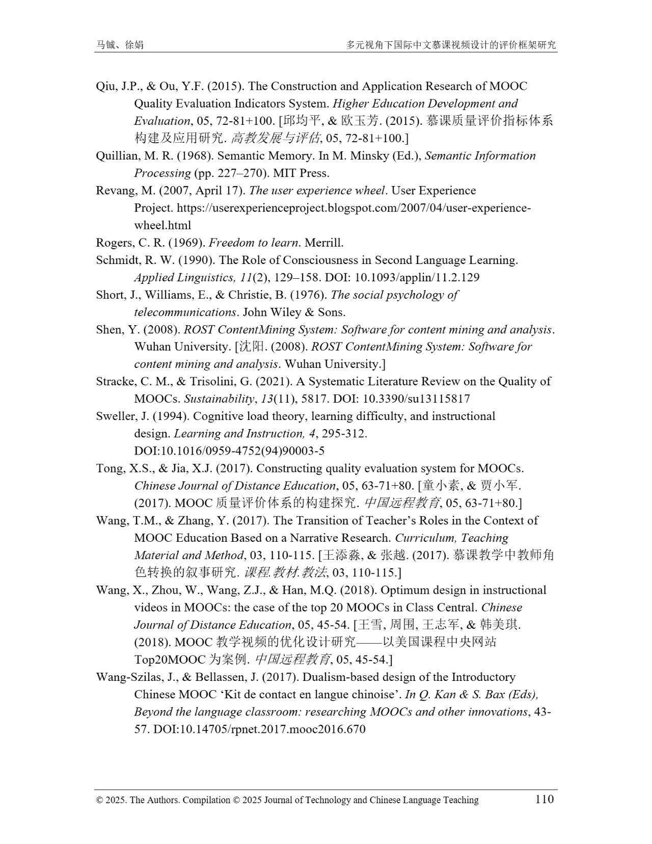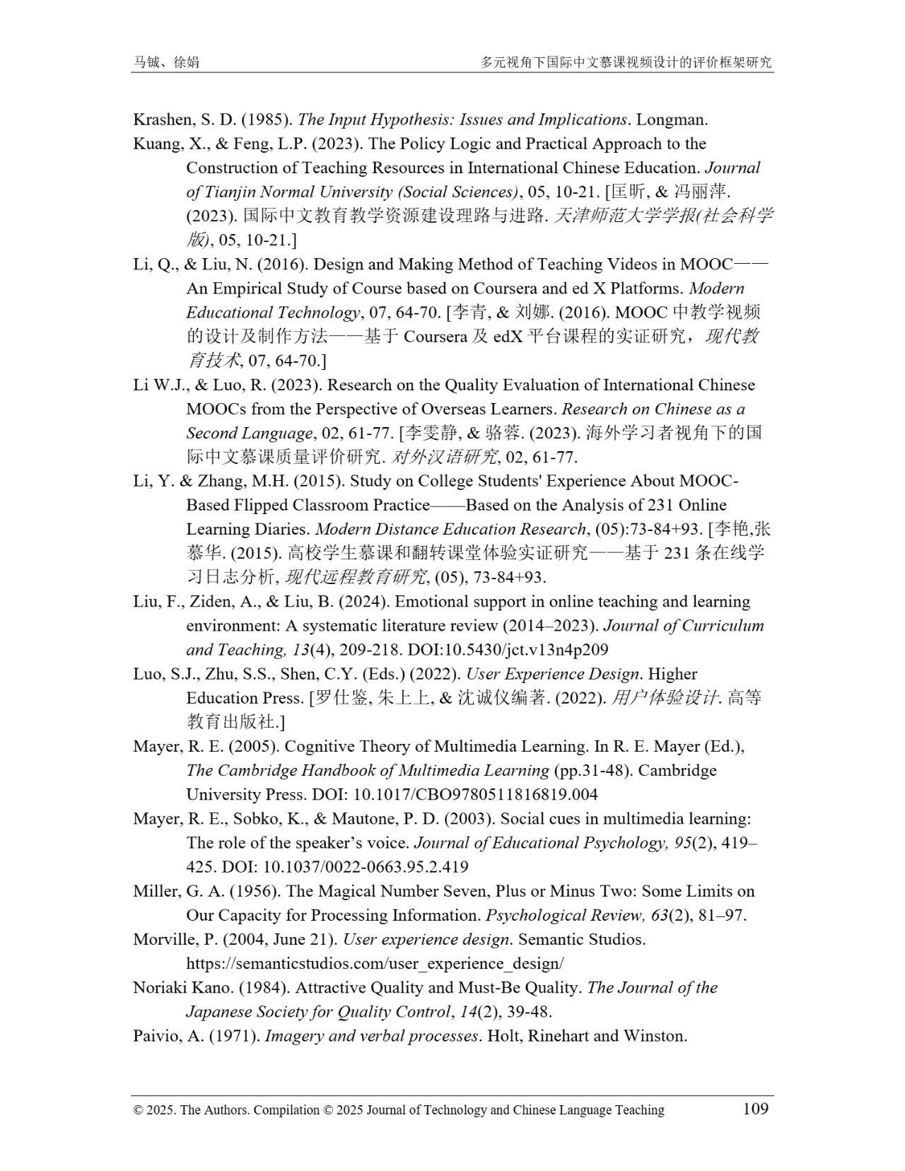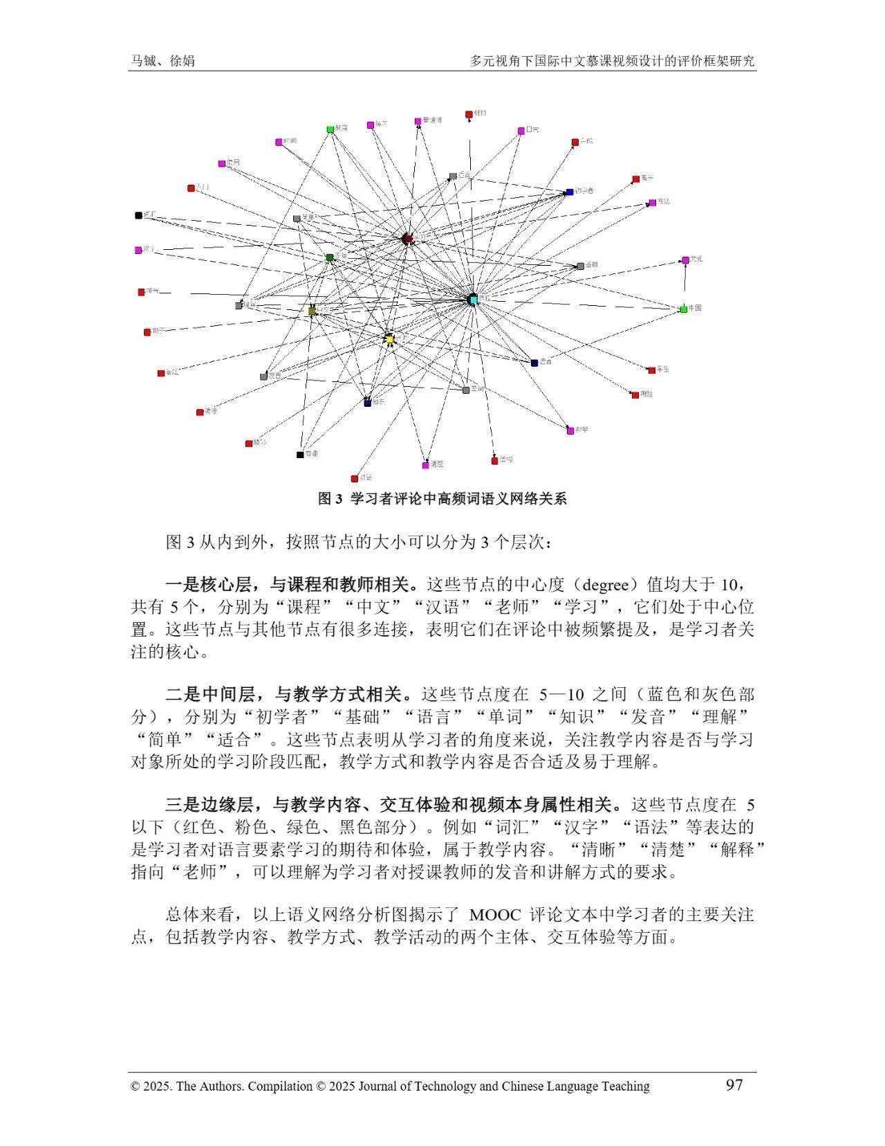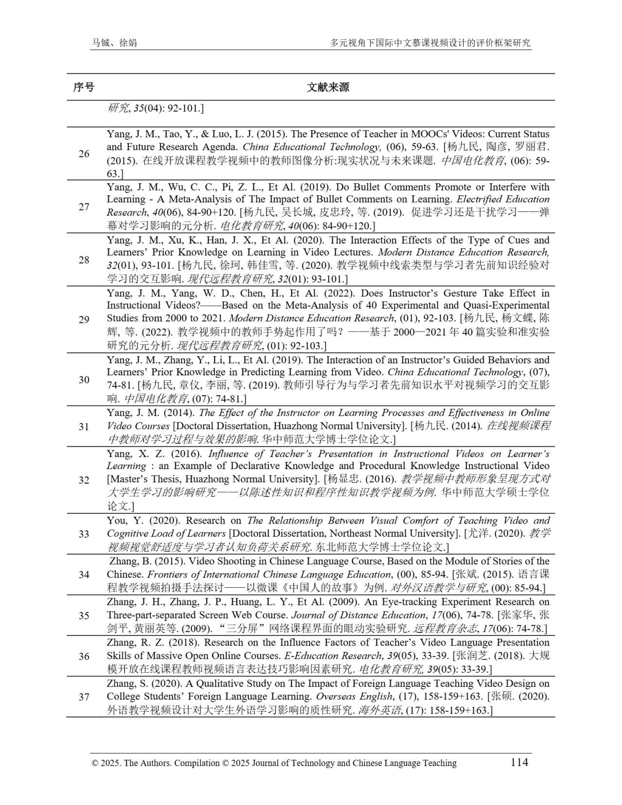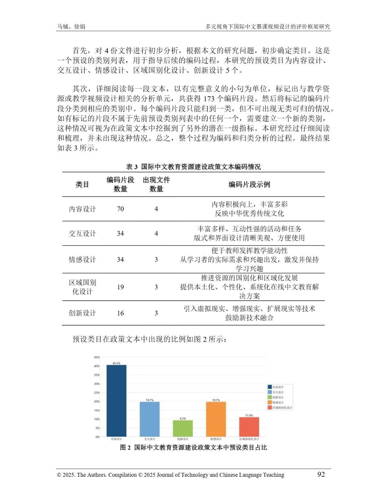 近日,我院教师马铖博士和信息科学学院徐娟研究员在Journal of Technology and Chinese Language Teaching 第16卷第1期中发表论文《多元视角下国际中文慕课视频设计的评价框架研究》。本研究聚焦国际中文慕课视频设计,构建兼政策参考、学术焦点与学习者需求的评价框架。基于政策文本和学术文献,自上而下提取核心要素;挖掘16门汉语慕课5339条学习者评论,自下而上提炼需求实践关切点。整合多重视角,形成含4项一级指标、9项二级指标、28个观测点的系统评价框架,为优化慕课视频设计、助力国际中文教育与中华文化传播提供学理依据 。