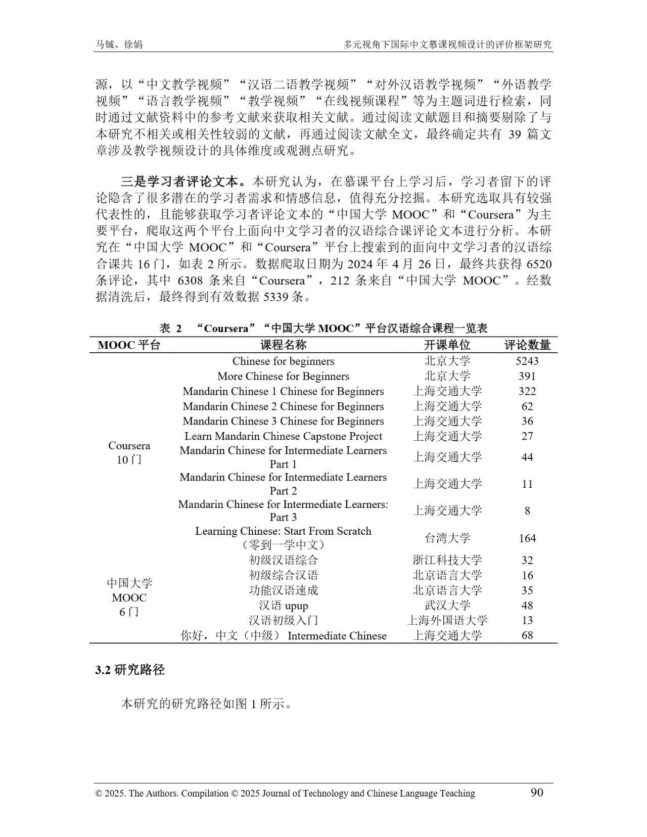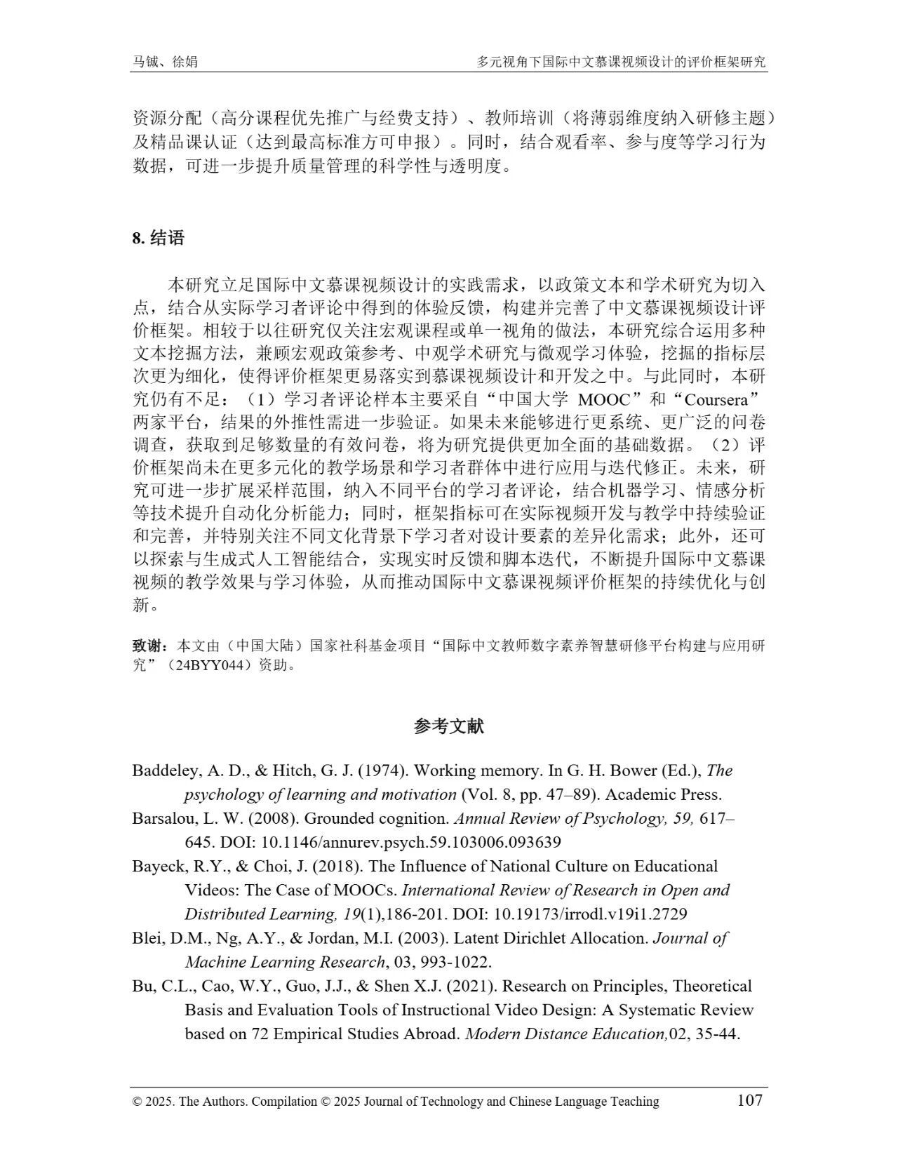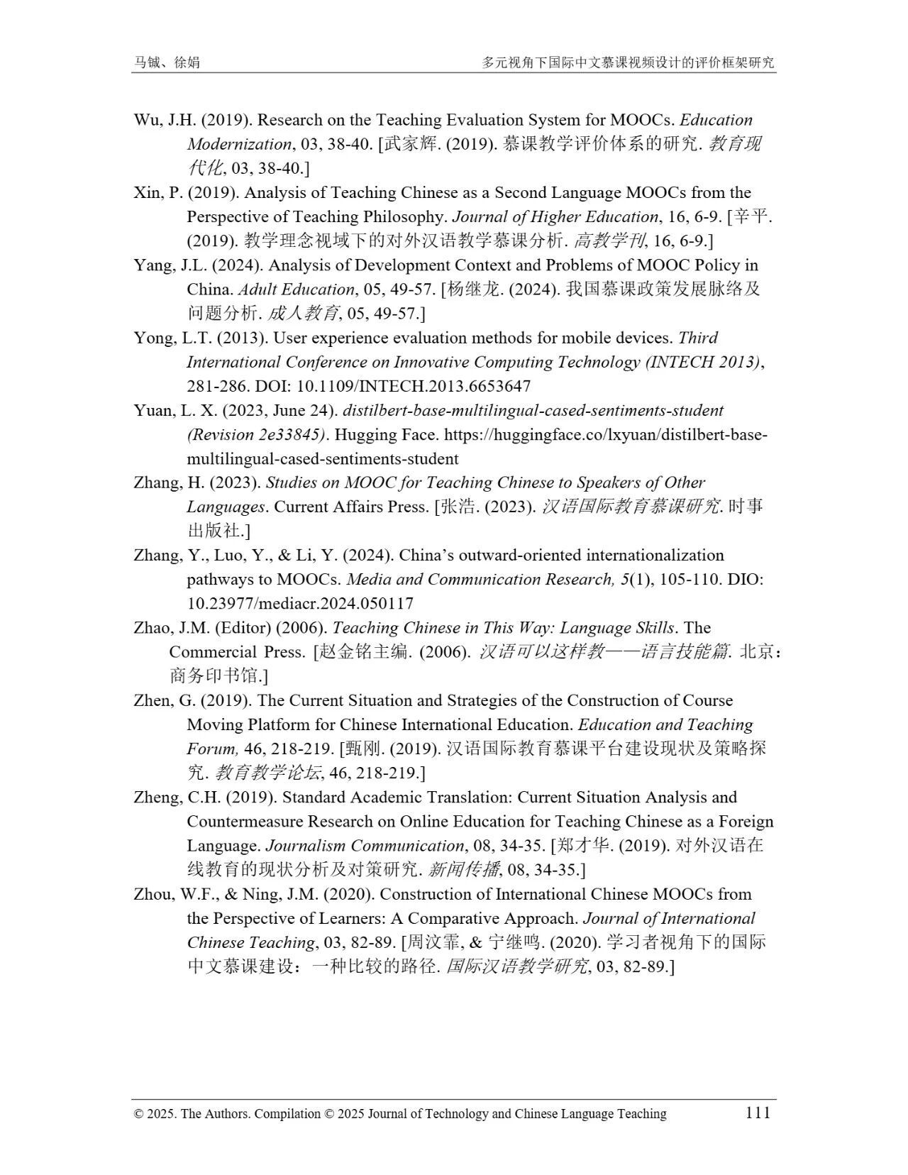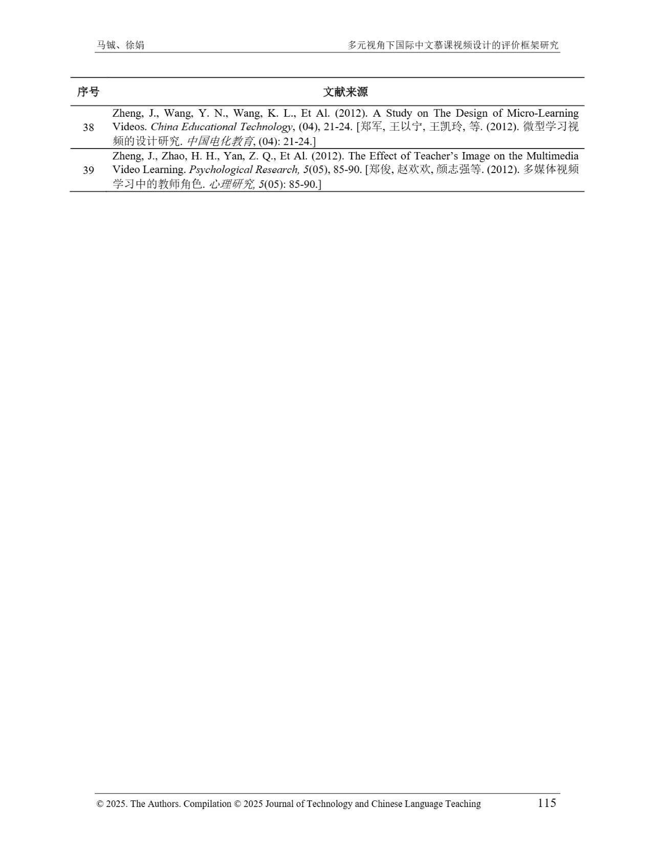 近日,我院教师马铖博士和信息科学学院徐娟研究员在Journal of Technology and Chinese Language Teaching 第16卷第1期中发表论文《多元视角下国际中文慕课视频设计的评价框架研究》。本研究聚焦国际中文慕课视频设计,构建兼政策参考、学术焦点与学习者需求的评价框架。基于政策文本和学术文献,自上而下提取核心要素;挖掘16门汉语慕课5339条学习者评论,自下而上提炼需求实践关切点。整合多重视角,形成含4项一级指标、9项二级指标、28个观测点的系统评价框架,为优化慕课视频设计、助力国际中文教育与中华文化传播提供学理依据 。