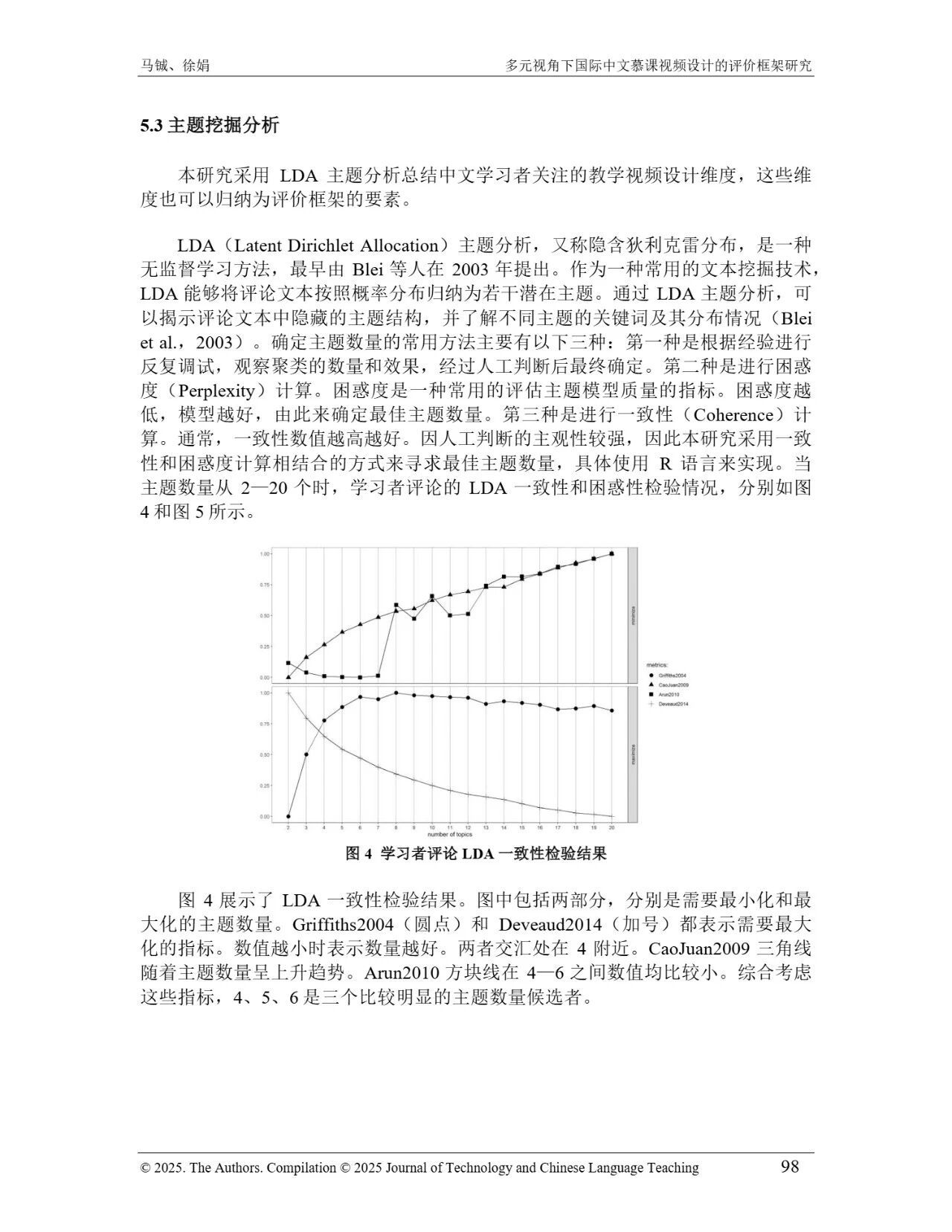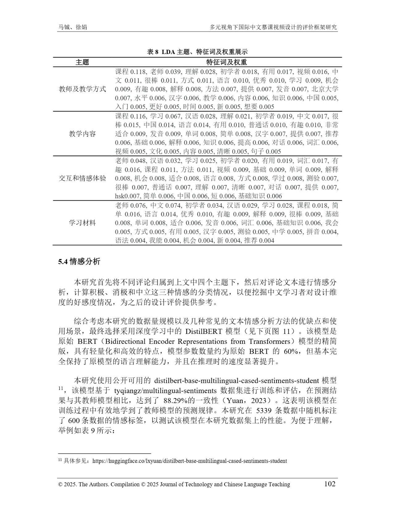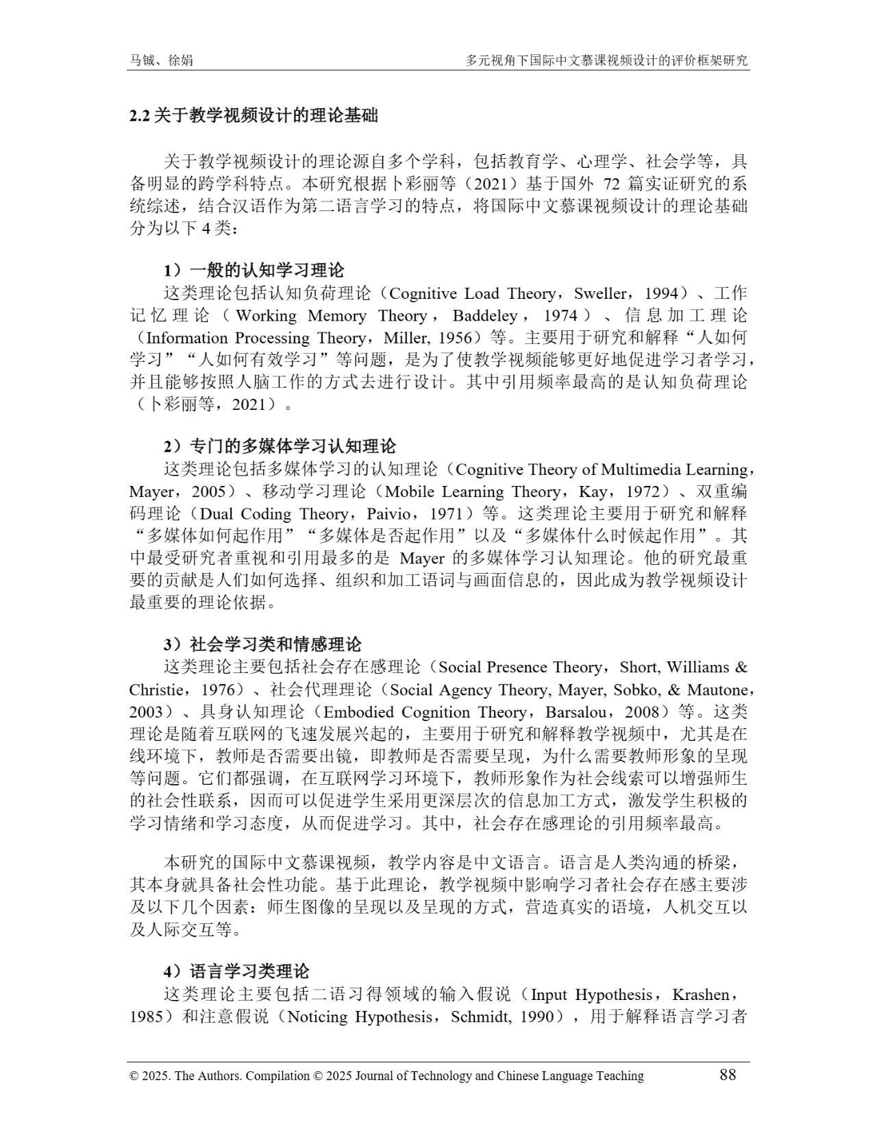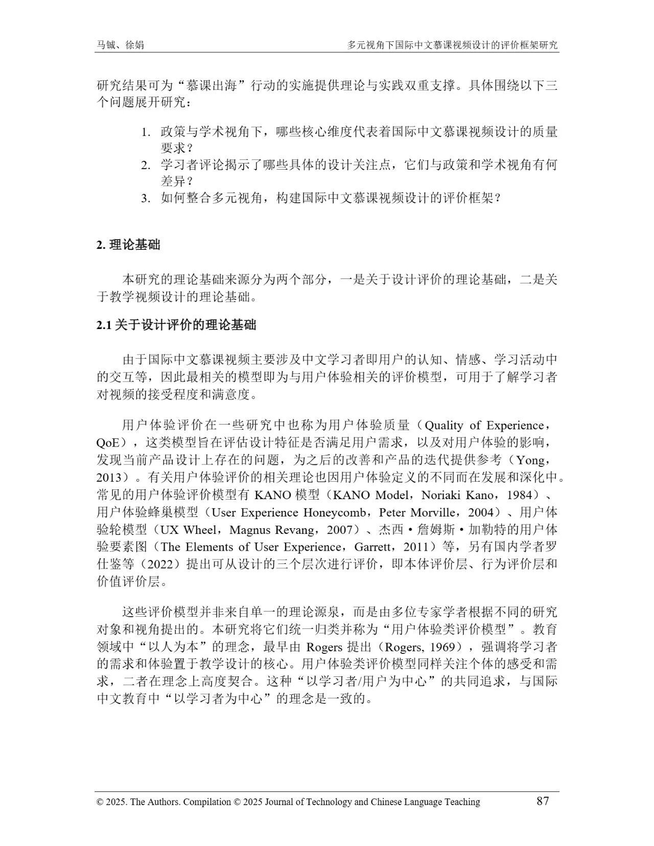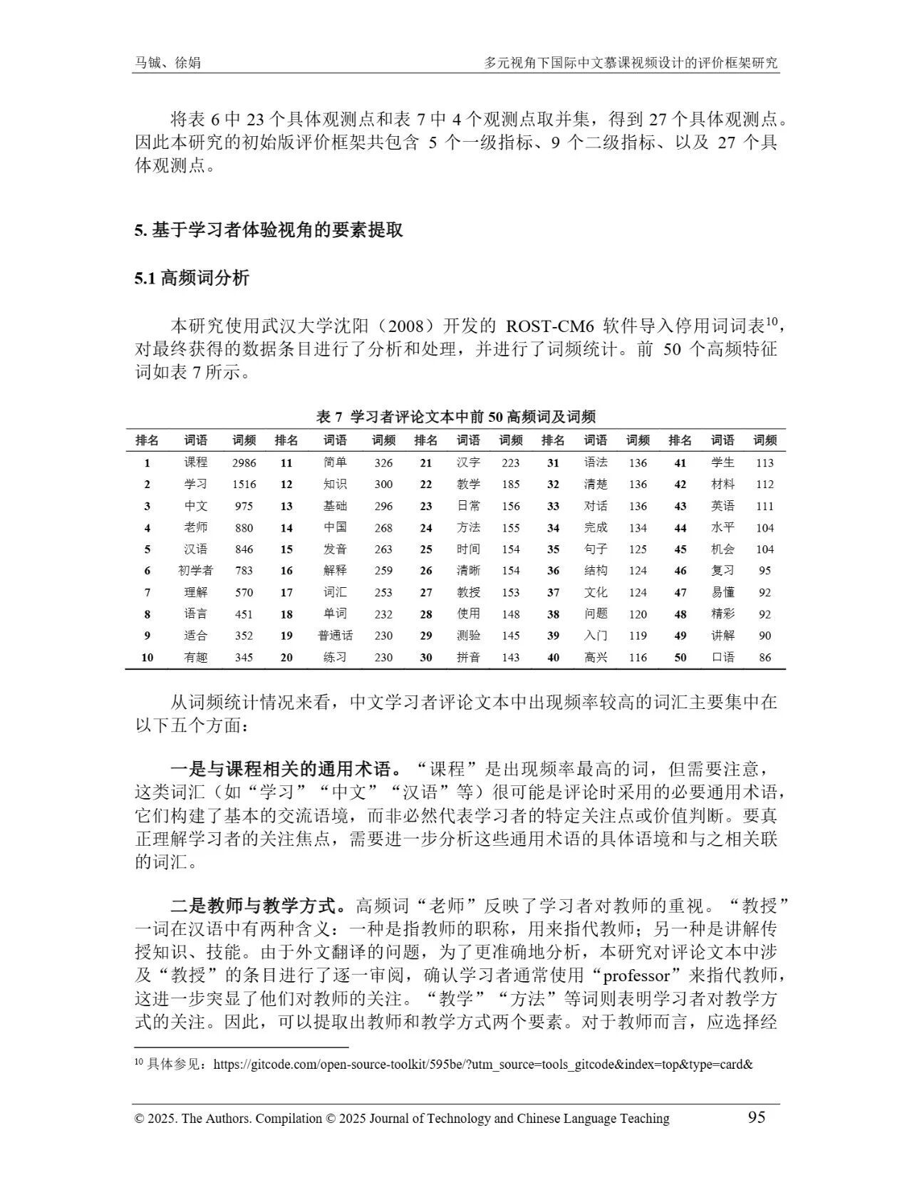近日,我院教师马铖博士和信息科学学院徐娟研究员在Journal of Technology and Chinese Language Teaching 第16卷第1期中发表论文《多元视角下国际中文慕课视频设计的评价框架研究》。本研究聚焦国际中文慕课视频设计,构建兼政策参考、学术焦点与学习者需求的评价框架。基于政策文本和学术文献,自上而下提取核心要素;挖掘16门汉语慕课5339条学习者评论,自下而上提炼需求实践关切点。整合多重视角,形成含4项一级指标、9项二级指标、28个观测点的系统评价框架,为优化慕课视频设计、助力国际中文教育与中华文化传播提供学理依据 。