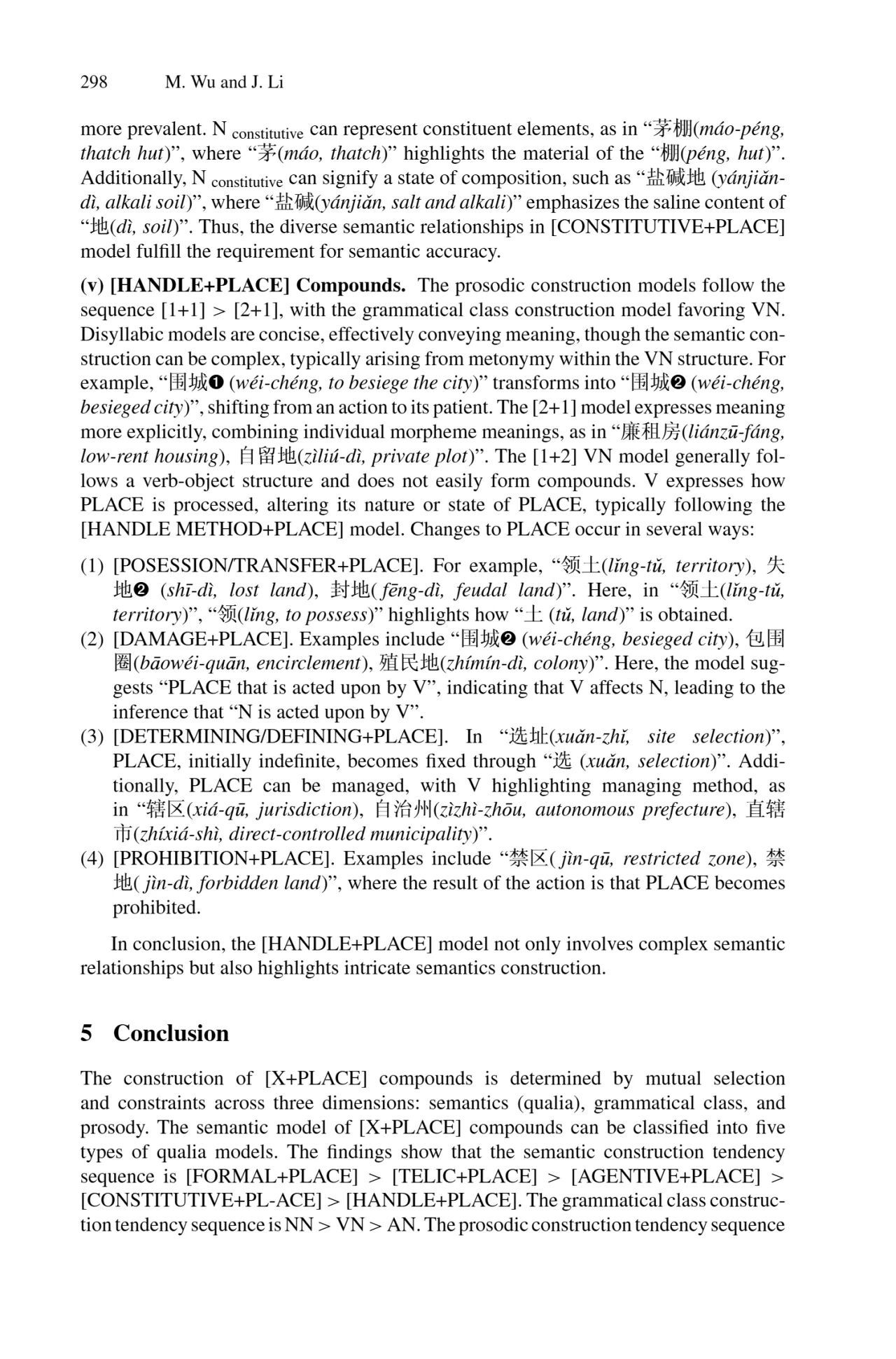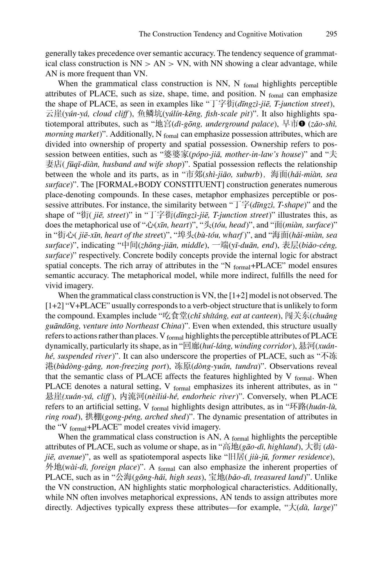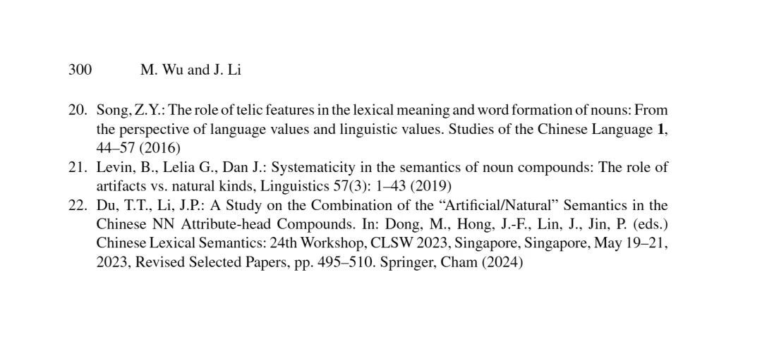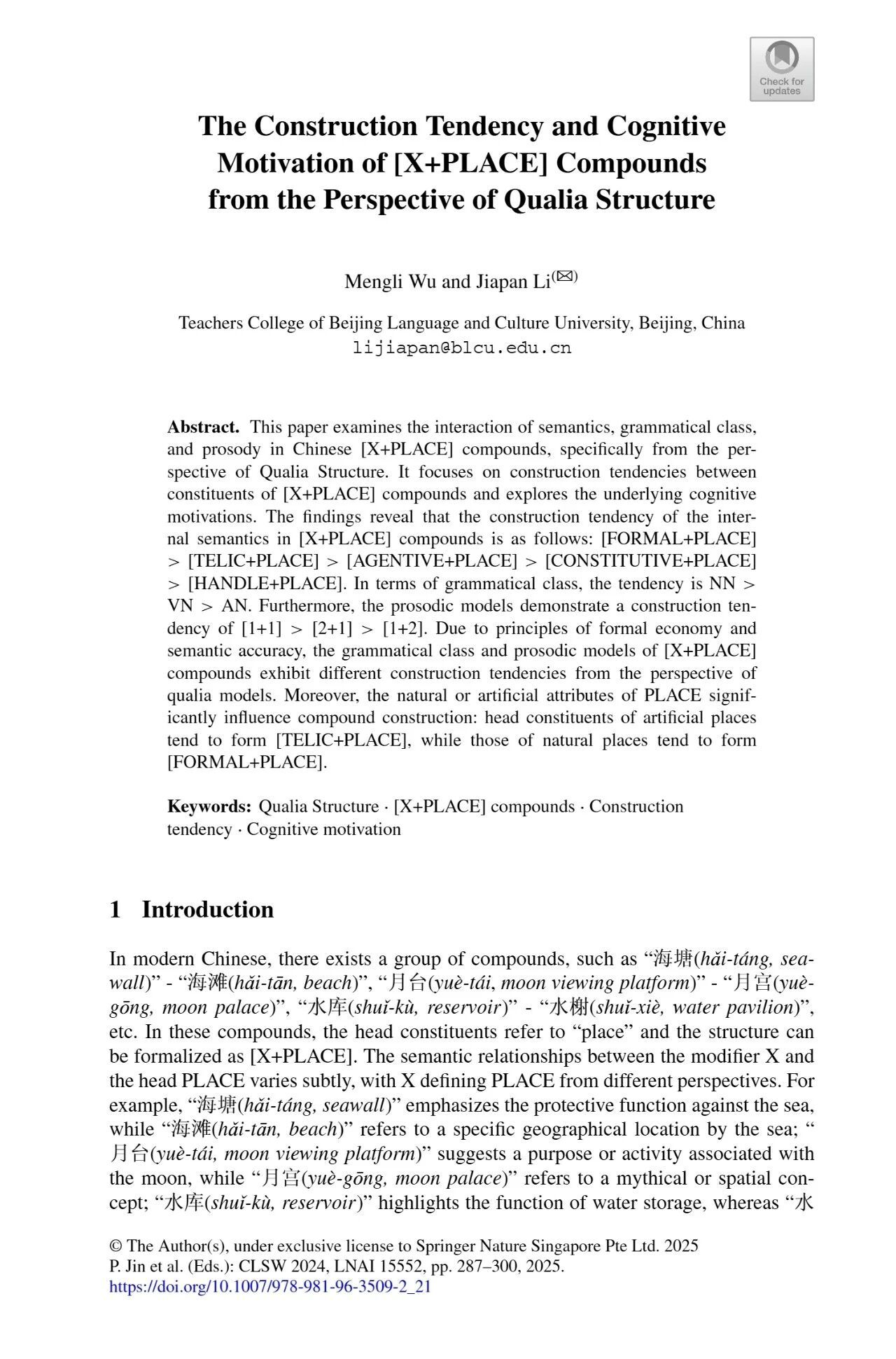 近日,我院教师李加𣁦博士和硕士研究生吴梦丽在Chinese Lexical Semantics发表论文The construction tendency and cognitive motivation of [X+PLACE] compounds from the perspective of Qualia Structure(物性结构视角下“X+处所”复合词的组配倾向与认知理据)。该文基于语义-形类-韵律界面互动的复合词研究路径,以物性结构为语义分类视角,深入挖掘“X+处所”复合词的组配倾向与认知理据,拓展了物性结构理论在汉语词汇语义研究领域的适用范围。