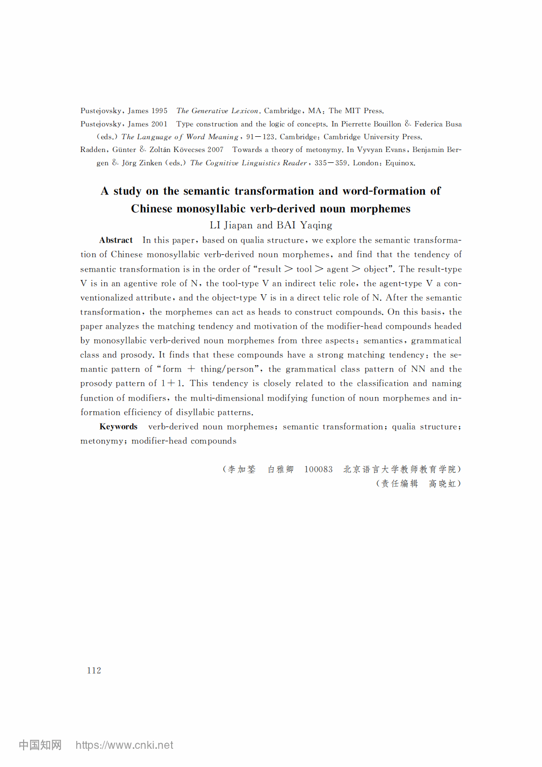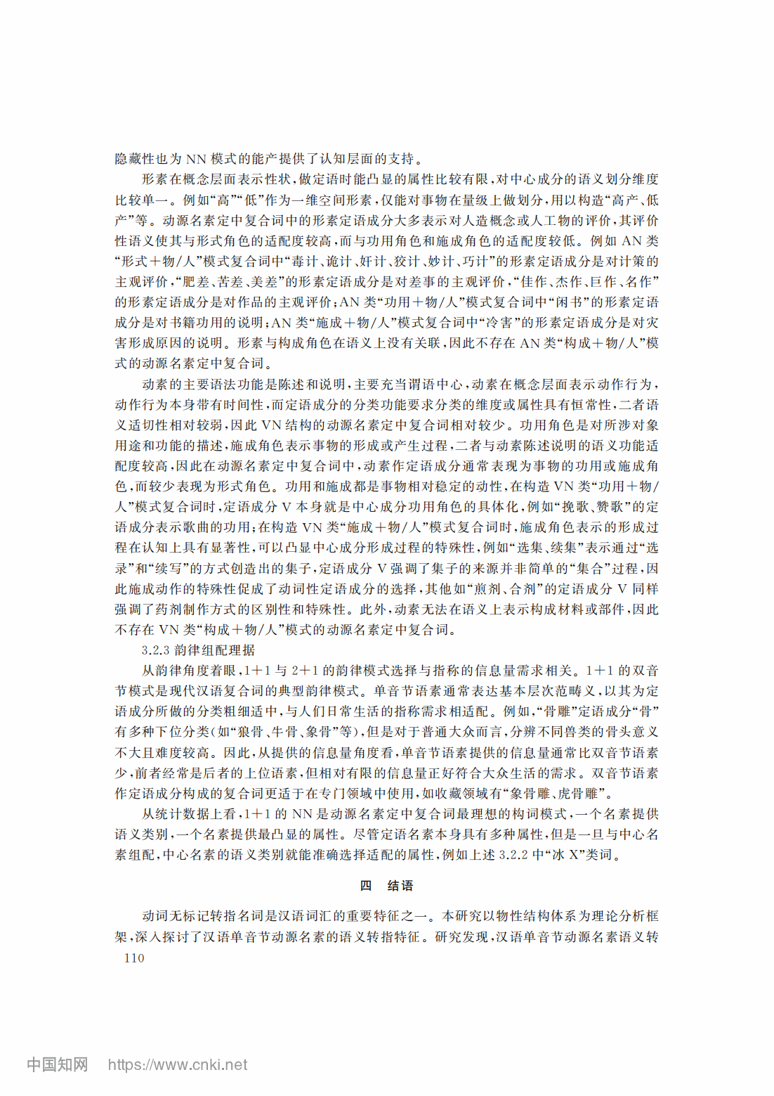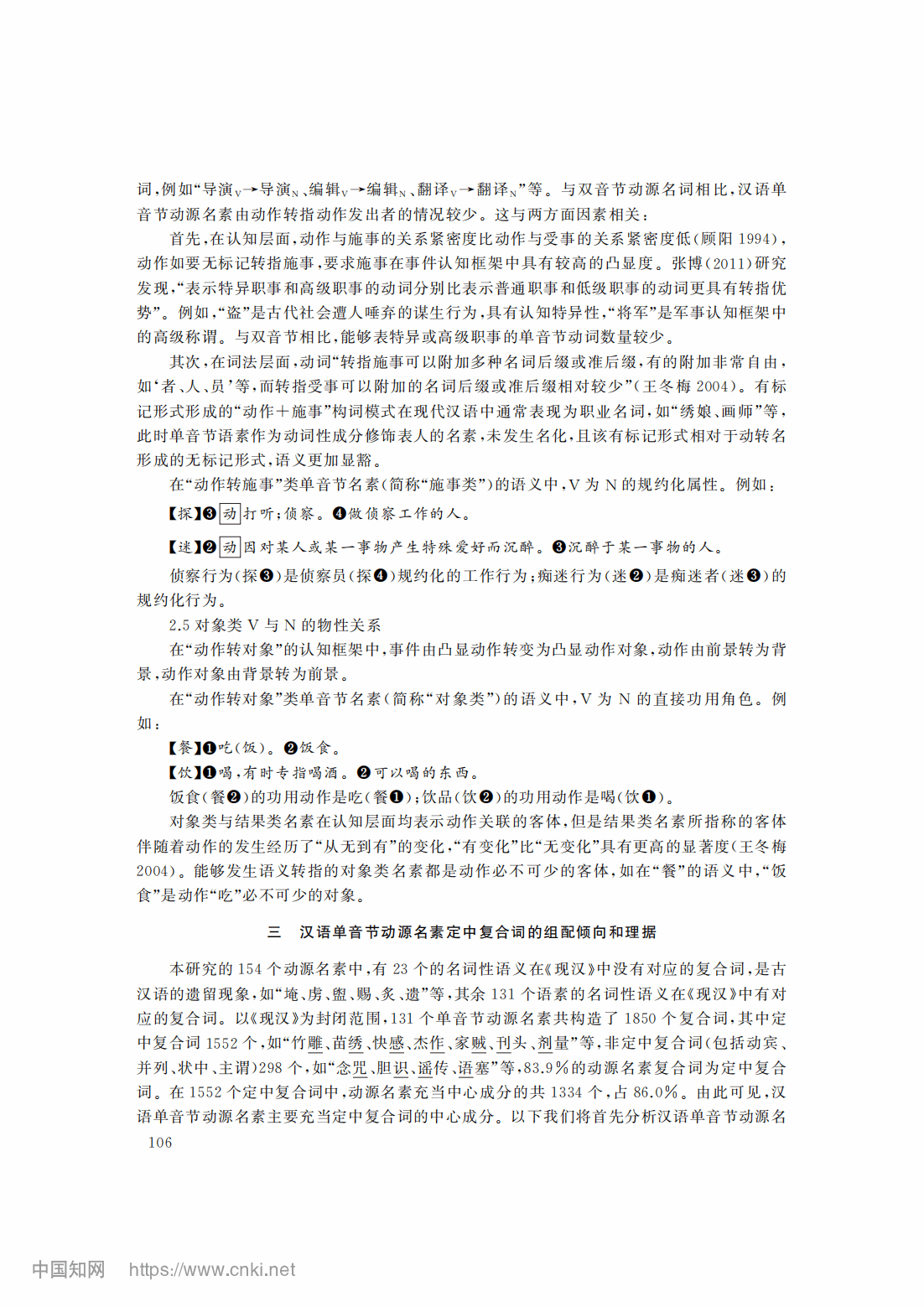 文章以汉语单音节动源名素为研究对象,基于物性结构理论探讨了单音节动源名素的语义转指特征,发现其语义转指倾向呈现出“结果>工具>施事>对象”的序列;结果类 V是 N 的施成角色,工具类 V 是 N 的间接功用角色,施事类 V 是 N 的规约化属性,对象类 V 是N 的直接功用角色。汉语单音节动源名素语义转指后主要作为中心成分构造定中复合词。在此基础上,文章从语义、形类和韵律三个层面分析了单音节动源名素定中复合词的组配倾向和理据。研究发现,该类复合词在“形式+物/人”语义模式、NN 形类模式和1+1韵律模式上呈现出强势组配倾向,这与定语成分的分类、命名功能,名素的多维限定功能以及双音模式的信息量大小紧密相关。