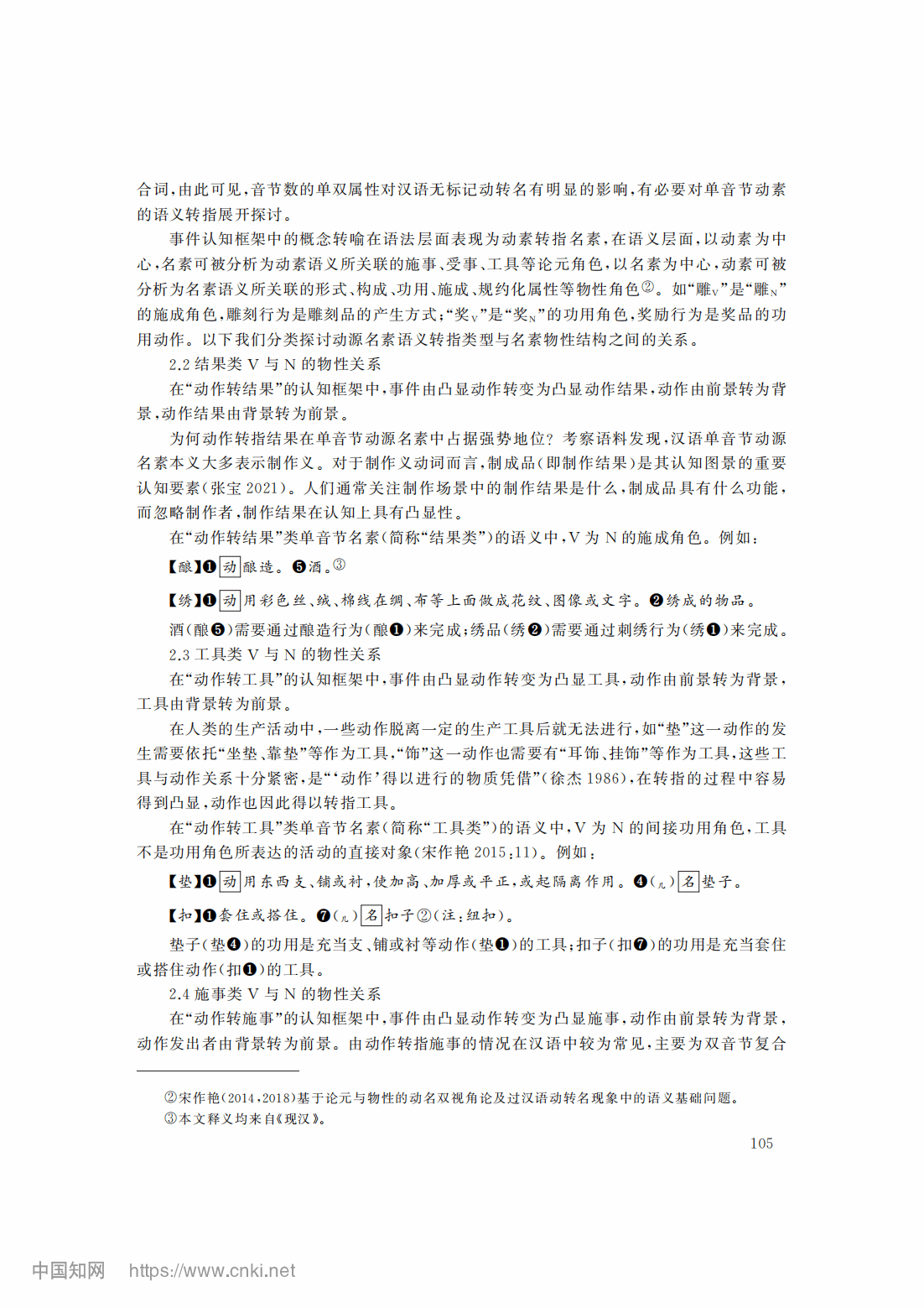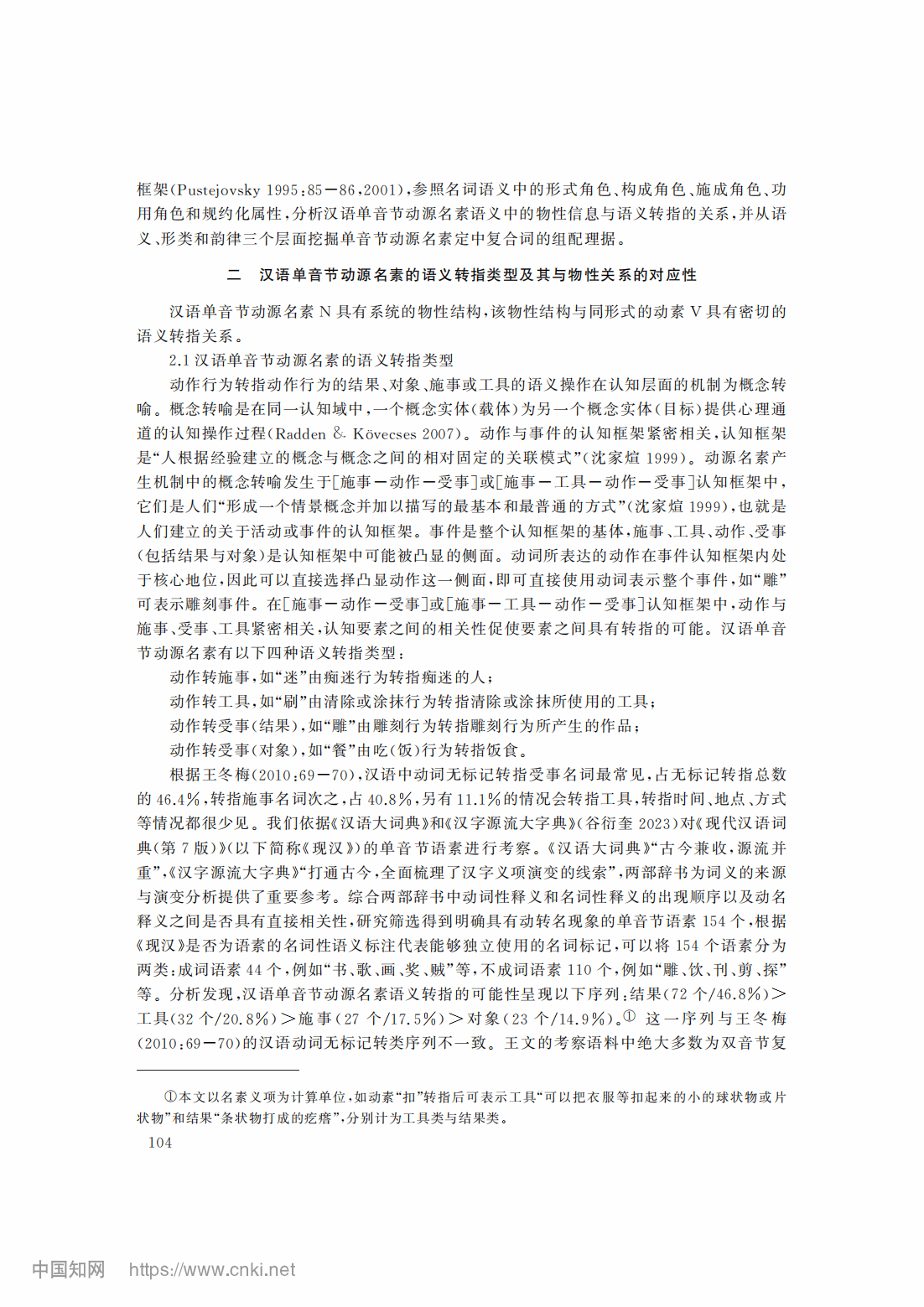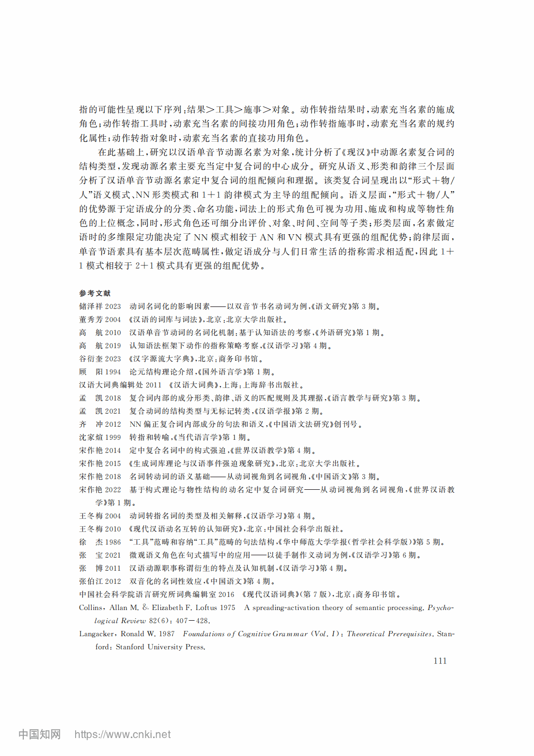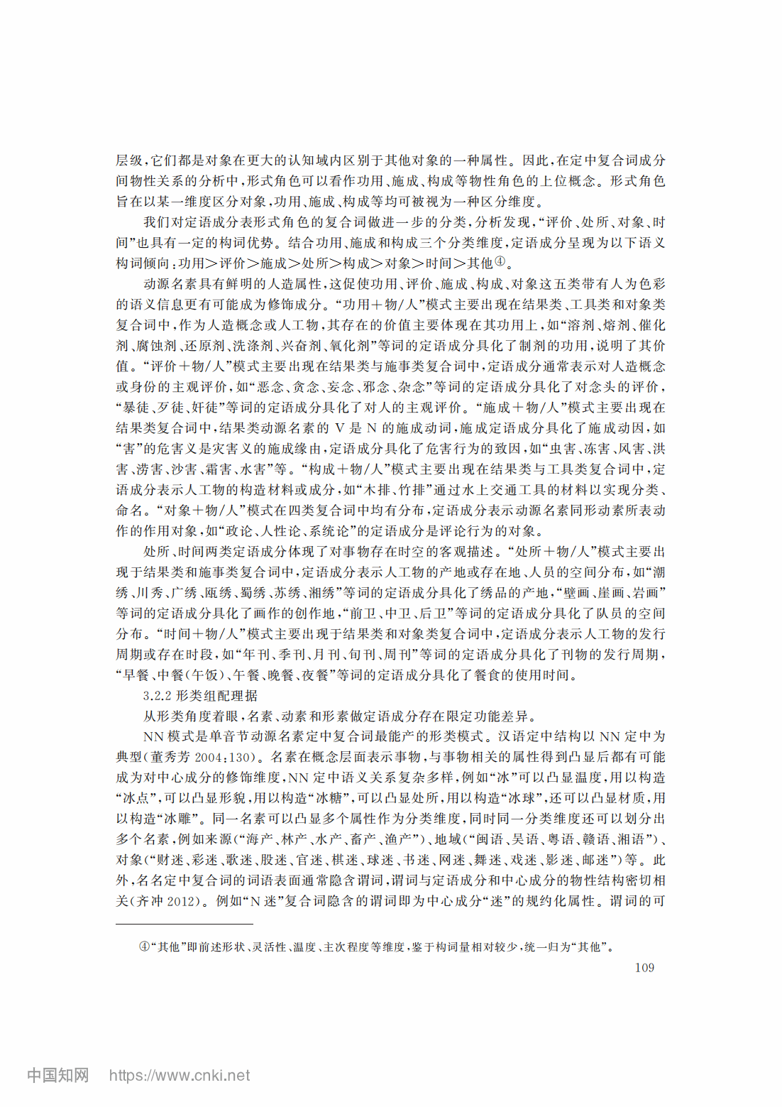 文章以汉语单音节动源名素为研究对象,基于物性结构理论探讨了单音节动源名素的语义转指特征,发现其语义转指倾向呈现出“结果>工具>施事>对象”的序列;结果类 V是 N 的施成角色,工具类 V 是 N 的间接功用角色,施事类 V 是 N 的规约化属性,对象类 V 是N 的直接功用角色。汉语单音节动源名素语义转指后主要作为中心成分构造定中复合词。在此基础上,文章从语义、形类和韵律三个层面分析了单音节动源名素定中复合词的组配倾向和理据。研究发现,该类复合词在“形式+物/人”语义模式、NN 形类模式和1+1韵律模式上呈现出强势组配倾向,这与定语成分的分类、命名功能,名素的多维限定功能以及双音模式的信息量大小紧密相关。