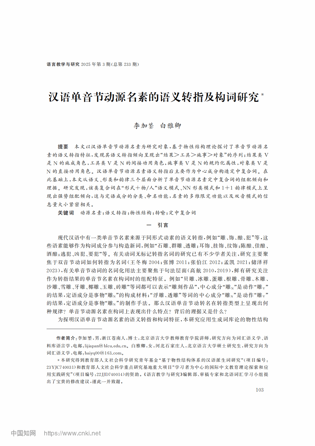近日,我院教师李加𣁦博士与硕士研究生白雅卿在《语言教学与研究》2025年第3期发表论文《汉语单音节动源名素的语义转指及构词研究》。