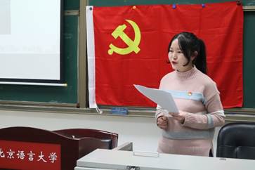 葛安丛带领同学们分别从当代媒体影像还原党史、博物馆文物留住党史、新时代青年在实践中传承党史三个方面探索让党史“活”起来的途径与方式。葛安丛、赵玲玲、韦曼璇等同学首先从《长津湖》《觉醒年代》等影视作品出发,结合优秀文艺背后的党史背景,总结党的胜利经验,汲取精神力量。在“博物馆文物留住党史”这一环节,大家让文物说话,用史实发言,孙维茁同学基于“革命与时代同频”暑期调研活动的成果,介绍了长辛店二七纪念馆、卢沟桥与抗日战争纪念馆等文化场馆中运用交互技术“活”起来的文物;郑天慧同学通过纪念馆公众号平台上的“虚拟展馆”一类交互服务,提出青年人应当更好地发挥主观能动性去感受百年党史承载的理想追求和实践品格。谈及新时代青年在学习工作中对党史的传承,支部成员分享了志愿、实践中青年的担当与思考,刘尚其同学在担任冬奥测试赛制冰专家翻译的过程中,被奥组委工作人员一丝不苟的工匠精神、运动员冲刺更高更快更强的信念所感动,进而全身心投入到翻译工作中来。常雨琪同学同样分享了自己在担任冬奥志愿者过程中有关服务能力提升等方面的学习培训情况,就习近平总书记对冬奥志愿者、冬奥赛事筹备的期望以及对生态建设与科学发展观等方面的重要指示精神畅谈了自己的感悟。符菁同学结合对湖南省花垣县十八洞村扶贫成果的调研活动,点出了共产党“走群众路线,为人民服务”这一执政基石的关键,表达了作为学生党员应担负时代使命、传承党史精神的决心。