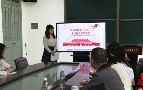 10月28日,根据学校“不忘初心、牢记使命”主题教育工作安排,人文社会科学学部学生党支部书记刘佳蕾为支部党员和入党积极分子讲授了“不忘汉教学子初心,牢记青年党员使命”专题党课。教育部第四巡回指导组成员牛跃平到会指导。