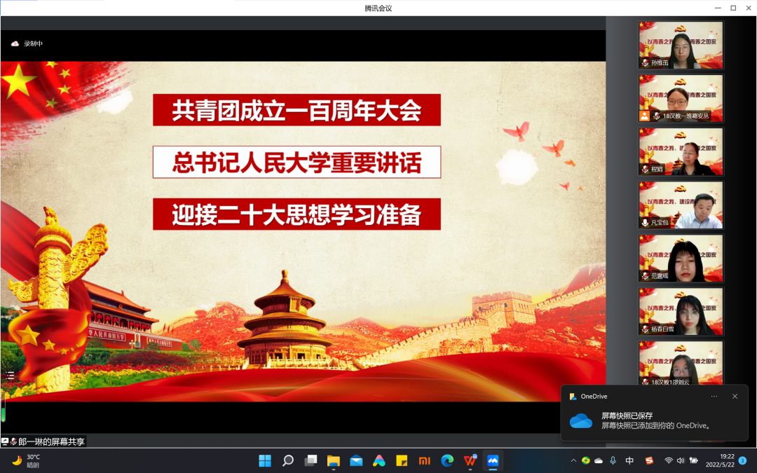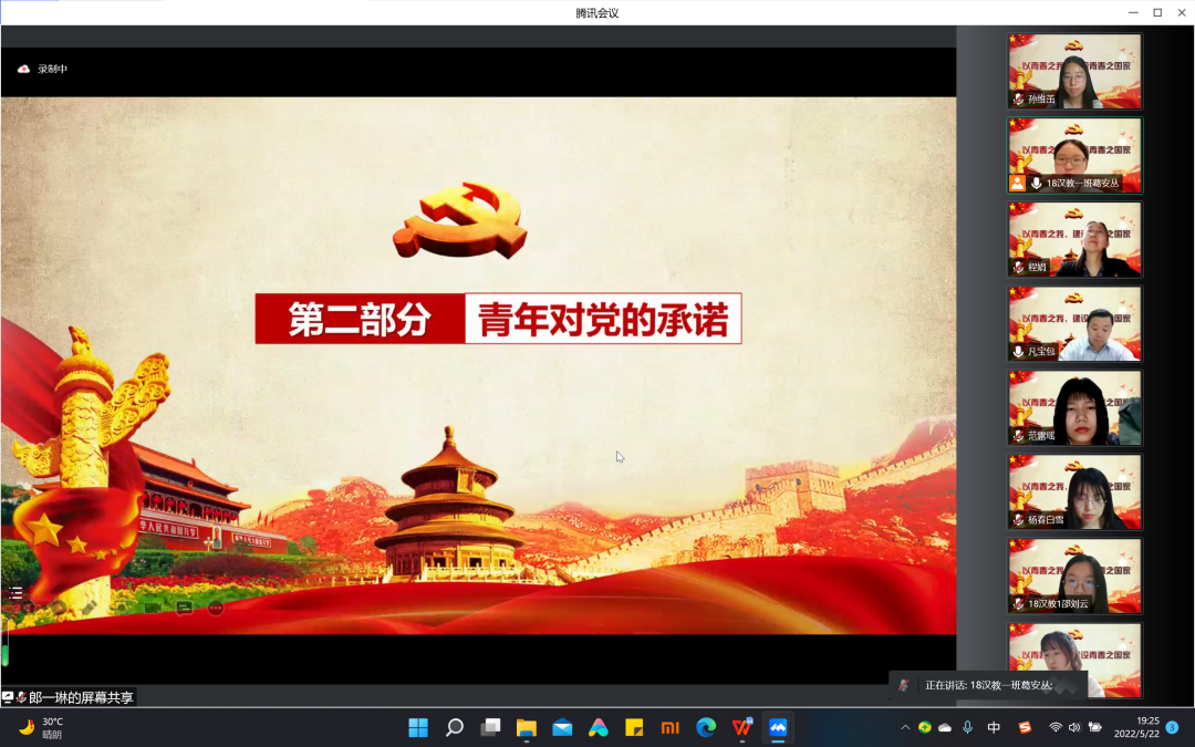 在“党对青年的期望”部分,党支部成员围绕共青团成立一百周年庆祝大会、习近平总书记在中国人民大学考察时的重要讲话及今年将要召开的中国共产党第二十次全国代表大会分享体悟、作出回应,结合自身实际,阐述在思想学习上与专业实践上的双重准备。