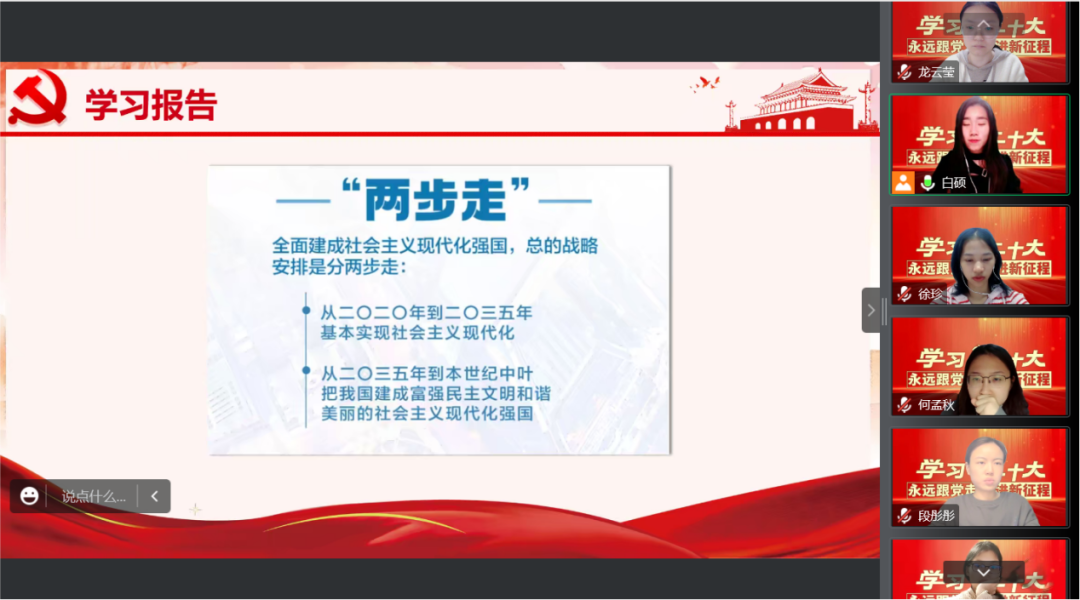 11月8日,汉语国际教育本科生第三党支部开展了“学思践悟二十大,砥砺奋进新征程”主题党课。本次主题党课以深入学习和讨论党的二十大报告内容,领悟和贯彻党的二十大精神为学习目标;学思践悟习近平总书记对青年人的嘱托,鼓励支部成员树立远大志向,争做新时代好青年为学习方向,主要通过支部书记领学与支部成员汇报学习感悟相结合的形式展开。