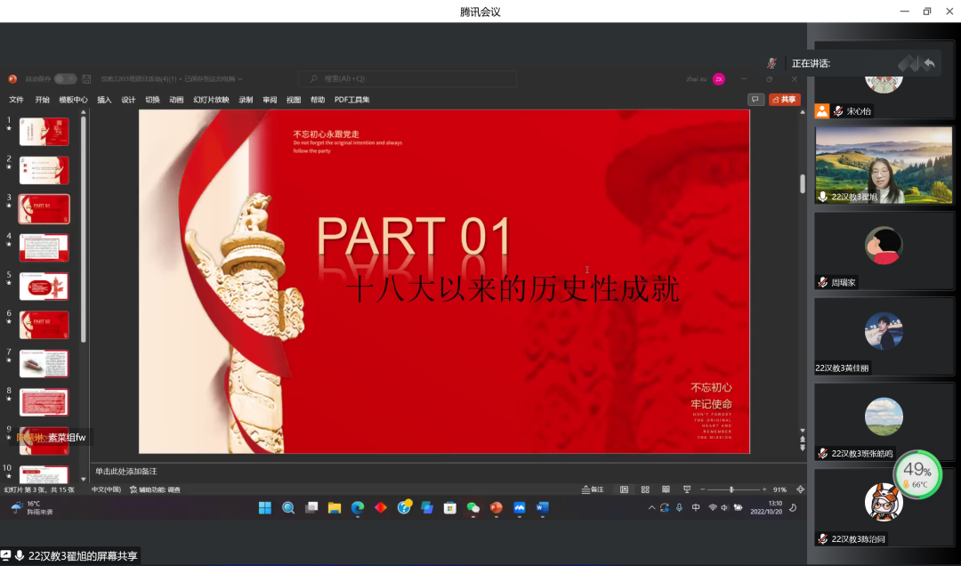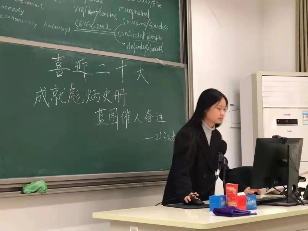 2021级汉语国际教育1班团支部举办了以“成就彪炳史册 蓝图催人奋进”为题的“党的二十大精神”专题学习活动。团支书陆锡莹结合习近平总书记在党的二十大开幕式上的报告,提醒同学们牢记习近平总书记提出的中国特色社会主义文化发展要求,努力提高自身思想觉悟,积极向党组织靠拢,为实现中华民族伟大复兴而奋斗。她结合文化力量的生动案例,向同学们阐述了推动文化发展的必要性。各小组积极讨论,派出代表上台分享本次学习会的收获。同学们交流了自己对本次团日活动的感受,提出了对社会主义文化发展的看法。通过本次学习活动,同学们深刻地认识到在新的历史条件下,应更加牢记新时代青年人的使命担当。