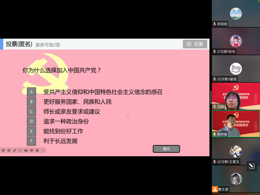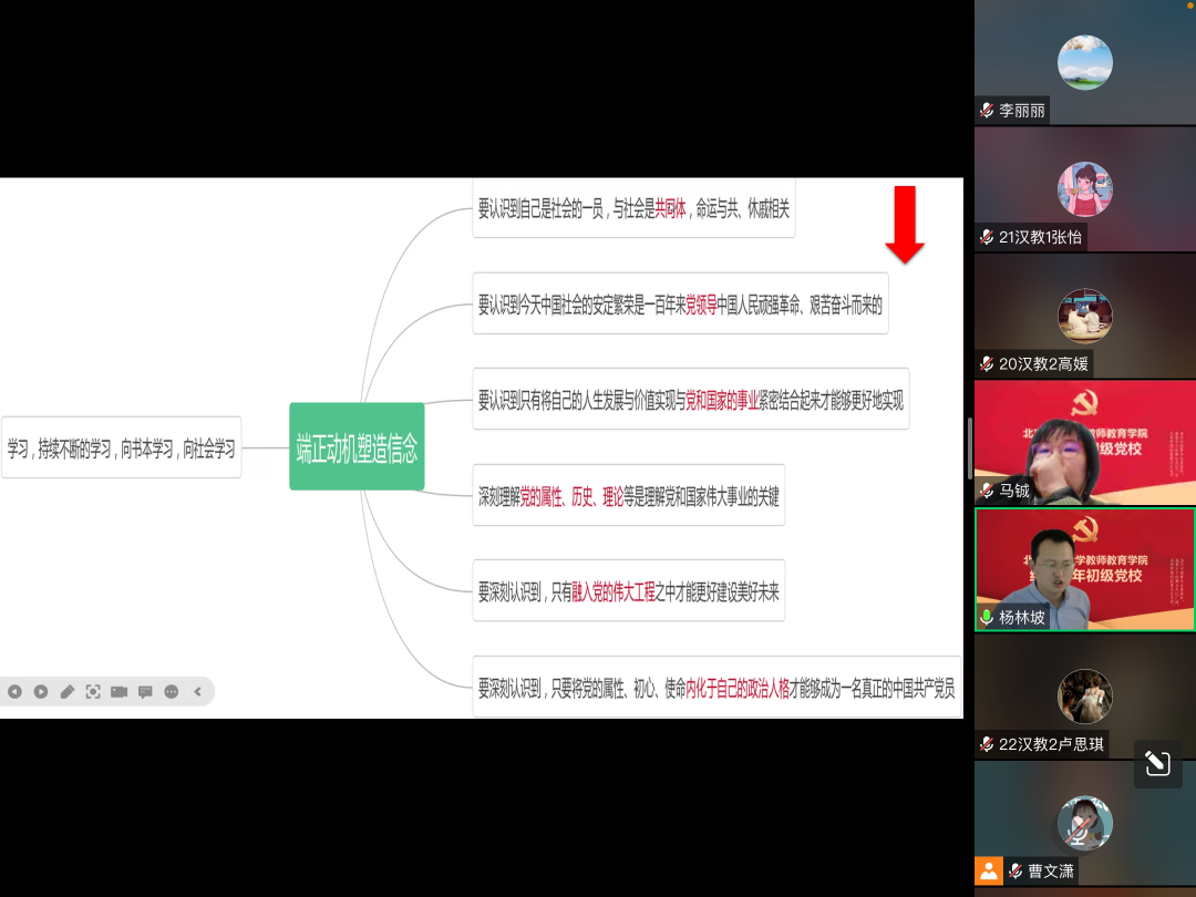 杨林坡老师结合党的历史与现实,阐述入党的深远意义,与各位同学互动交流入党动机,分享自己作为党员的感受,加深了同学们对党的理解与认同。