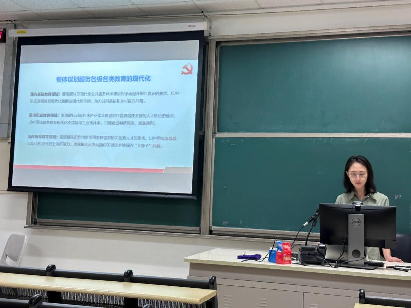 曹文潇书记首先带领支部党员梳理和学习了习近平总书记关于教育的重要论述,结合世界强国的现代化经验、中国教育的发展历程等内容,凸显了中国式现代化过程中教育、人才与科技的重要战略支撑作用;随后从基础教育、职业教育和高等教育三方面,就系统推进教师教育现代化的相关问题进行了探讨;最后,她落脚于个人发展层面,强调了创新的重要性,鼓励党员做好“学”与“思”之间的平衡,不断促进思维发展,实现个人的进步.