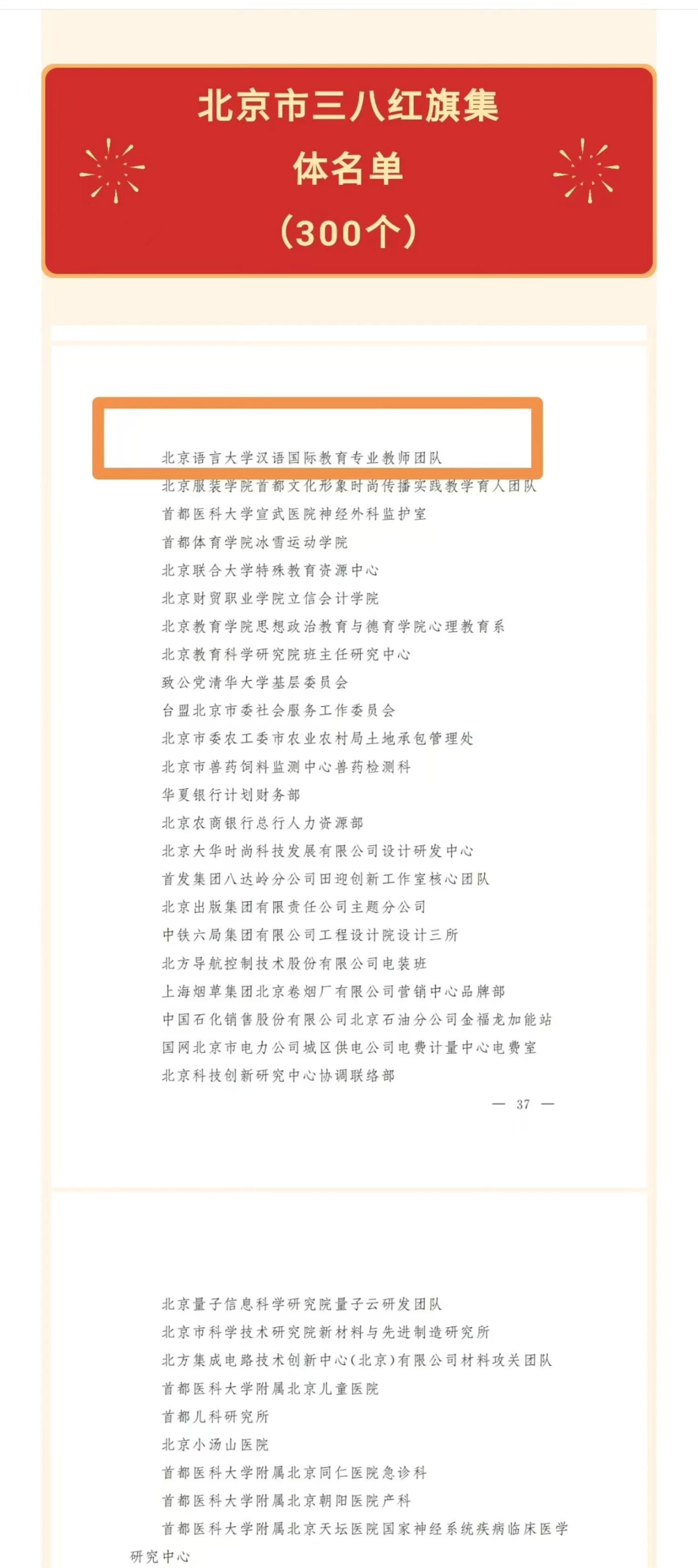 为表彰先进、树立榜样,激励首都广大妇女自尊自信、自立自强,奋进新征程、建功新时代,近日北京市妇女联合会、北京市总工会、北京市人力资源和社会保障局联合开展了北京市三八红旗奖章和北京市三八红旗集体评选表彰工作。我校汉语国际教育专业教师团队荣获“北京市三八红旗集体”称号,这也是我校首次获得该项殊荣。