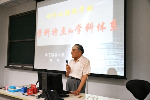 2019年9月11日下午2点,由北京语言大学人文社会科学学部汉语教育学院联合学校教务处举办的“汉语第二语言教学系列专题”第一次讲座在主南200教室顺利举行。汉语教育学院刘珣教授作为主讲人,本课程负责人、人文社会科学学部副主任施家炜老师担任主持人。本次讲座主题为“对外汉语教学的学科特点和学科体系”,吸引了近百名本科生、研究生、留学生以及教师参加。