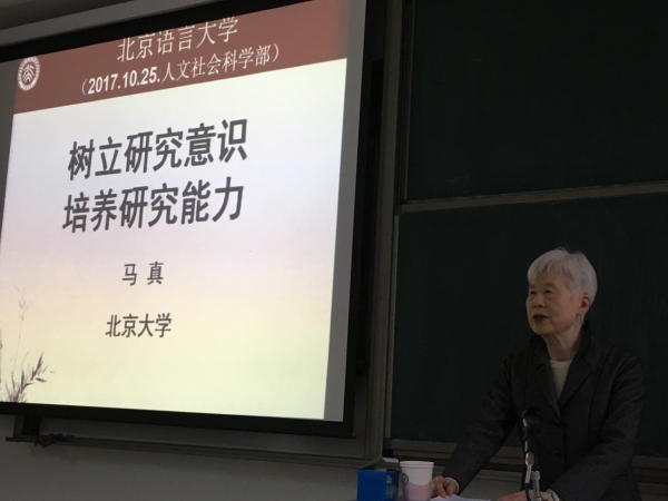 离开讲台多年,在这个金秋送爽的下午,马真先生带着她对做学术的满腔热忱来到北语,在三尺讲台上为莘莘学子做讲座。讲座开始,马真先生首先提出同学们要为未来打下深厚而坚实的基础,包括知识基础、能力基础和做人的基础,而本次讲座的主题则是能力问题中的一个小问题——“研究能力”。能力基础里所说的独立思考的能力、创新思维的能力、动手的能力就都属于通常所说的研究能力。马真先生表示,无论同学们将来从事什么工作,都应该注意树立并增强研究意识,培养自己有一个善于研究、善于思考的头脑,培养自己的独立研究能力。而“发现问题”的能力则十分关键,因为这是我们在科学研究上能获得成果的起点。发现问题后,就需要去分析问题、解决问题。而在分析问题、解决问题的过程中,很需要一种能力,那就是善于比较并善于从多角度、多方位、多层面反复思考,不断验证的能力。