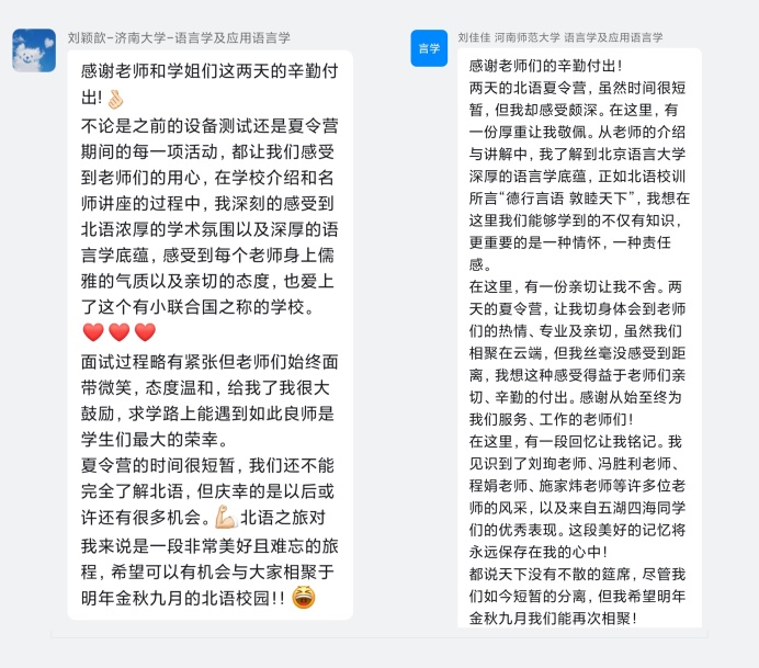 陕西师范大学的陈彦婷同学、浙江师范大学的龚伶俐同学、天津外国语大学的邢雪同学和北京语言大学的刘尚其同学、王曼茜同学代表近二百名营员发表了参营感言。同学们对主办团队表达了诚挚的感谢,表示夏令营的丰富活动让自己更加坚定了从事语言学研究和国际中文教育研究的信念,将牢记专家的教诲,“刻苦为人,殷勤传学”,以“德行言语,敦睦天下”的使命担当,发奋学习。其他同学也纷纷在钉钉群中用文字的形式表达了切身感受。