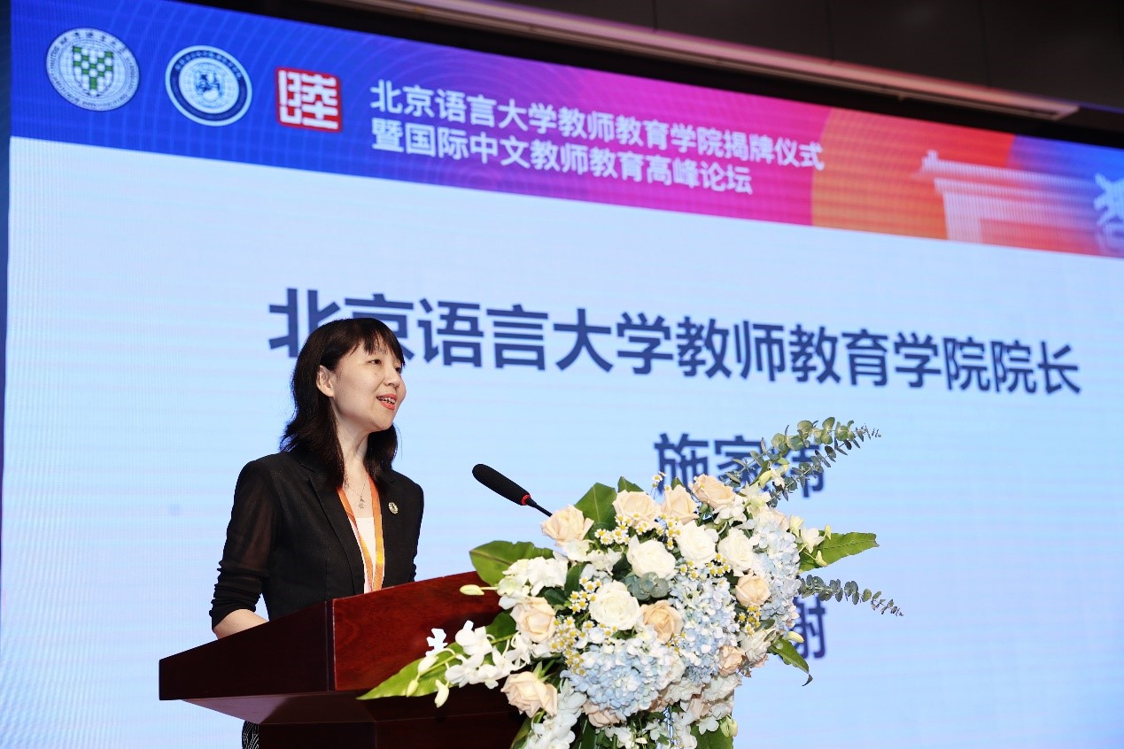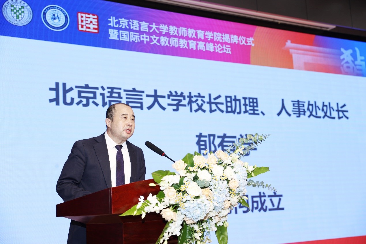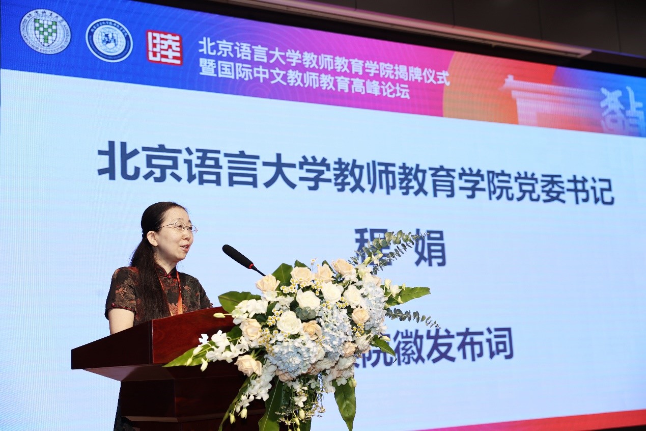 北京语言大学校长助理、人事处处长郁有学宣布机构成立;教师教育学院党委书记程娟教授宣读院徽发布词。