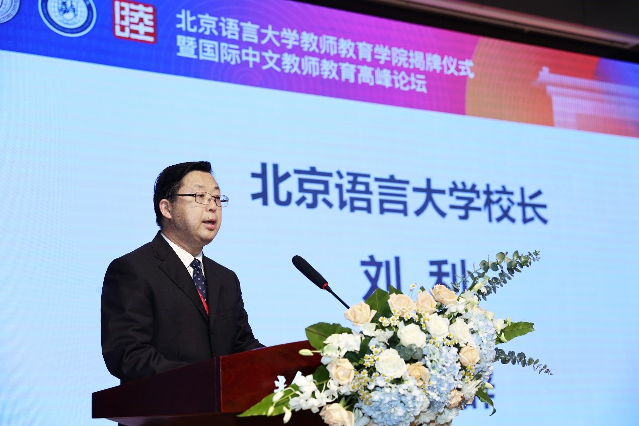 刘利校长在欢迎辞中指出,北京语言大学是我国高校中以开展国际中文教育为主要特色和优势的多科性国际型大学,培养学习中文与中华文化的留学生和从事中文教育的教师,是国家赋予这所大学的两个重要使命。今年适逢北京语言大学建校60周年。60年来,北语着眼于服务国家外交大局,积极探索学科专业发展之路,大力推进教育教学改革,为我国的国际中文教育事业发展做出了历史性贡献。为适应新时代国际中文教育事业发展的需求,更好地培养卓越中文教师,学校决定整合全校教育教学资源组建教师教育学院。经过广泛调研、深入论证和精心实施,学院已于2020年12月正式宣告成立。组建教师教育学院既是学校因应新时代教师教育需求的重要举措,也是学校国际中文教育专业内涵发展的必然结果。北京语言大学的中文教师教育有着深厚的历史传统和突出的育人成绩,这为教师教育学院的建立奠定了坚实的基础。教师教育学院的成立是学校发展历程中的一件大事,标志着我校国际中文教育的学科专业建设由此开启了新征程。当前国际中文教育正处于历史机遇和挑战并存的特殊时期,一方面党和国家对国际中文教育师资队伍建设寄予厚望,全球中文学习者的不断增多对教师的需求量也在日益加大。但同时要看到,我们在中文教师培养方面,从学科体系构建、专业内涵建设到教育教学实践,都还存在着许多亟待解决的理论问题和操作层面的短板。因此,北京语言大学成立教师教育学院,决不是简单的学院更名和牌子替换,而是深化教师教育改革、推动教师教育科学化的必然之举,是强化学校办学特色、巩固办学优势的必然之举。一是明确中文教师培养的“师范性”,推动中文教师的培养范式与世界通行的“师范教育”接轨,从而提升国际中文教师教育的专业化水准。二是推动中文教师教育的基础理论研究和专业内涵建设,将教育学的一般原理与中文教师培养的实际相结合,形成具有国际中文教育特色的教师教育理论,为专业内涵建设和育人实践提供理论支撑。三是深化中文教师教育模式改革,推动中外学生一体化培养,本硕博三个学历层次贯通培养,利用基地扩大选才进行拨尖培养,着力造就卓越中文教师和未来教育家。为此,当前和今后教师教育学院应着力加强四大体系建设。第一,着力构建国际中文教师教育的学科体系。第二,着力构建本硕博一体设计、每个层次各有专业侧重的中文教师培养体系。第三,着力构建适应多元化教育需求的课程体系。第四,着力构建国际中文教师的培养标准和评价体系。刘利校长希望教师教育学院以此次揭牌为新起点,发扬优良传统,加强顶层设计,完善发展规划,汇聚高水平人才,勇于探索,勇于创新,推动学院建设和教师教育事业向着高起点、高质量的目标前行,不断为国际中文教师教育贡献新理论、新方案和新经验,为培养造就更多德才兼备的卓越中文教师和教育人才,推动国际中文教育事业高质量发展做出新的更大贡献!