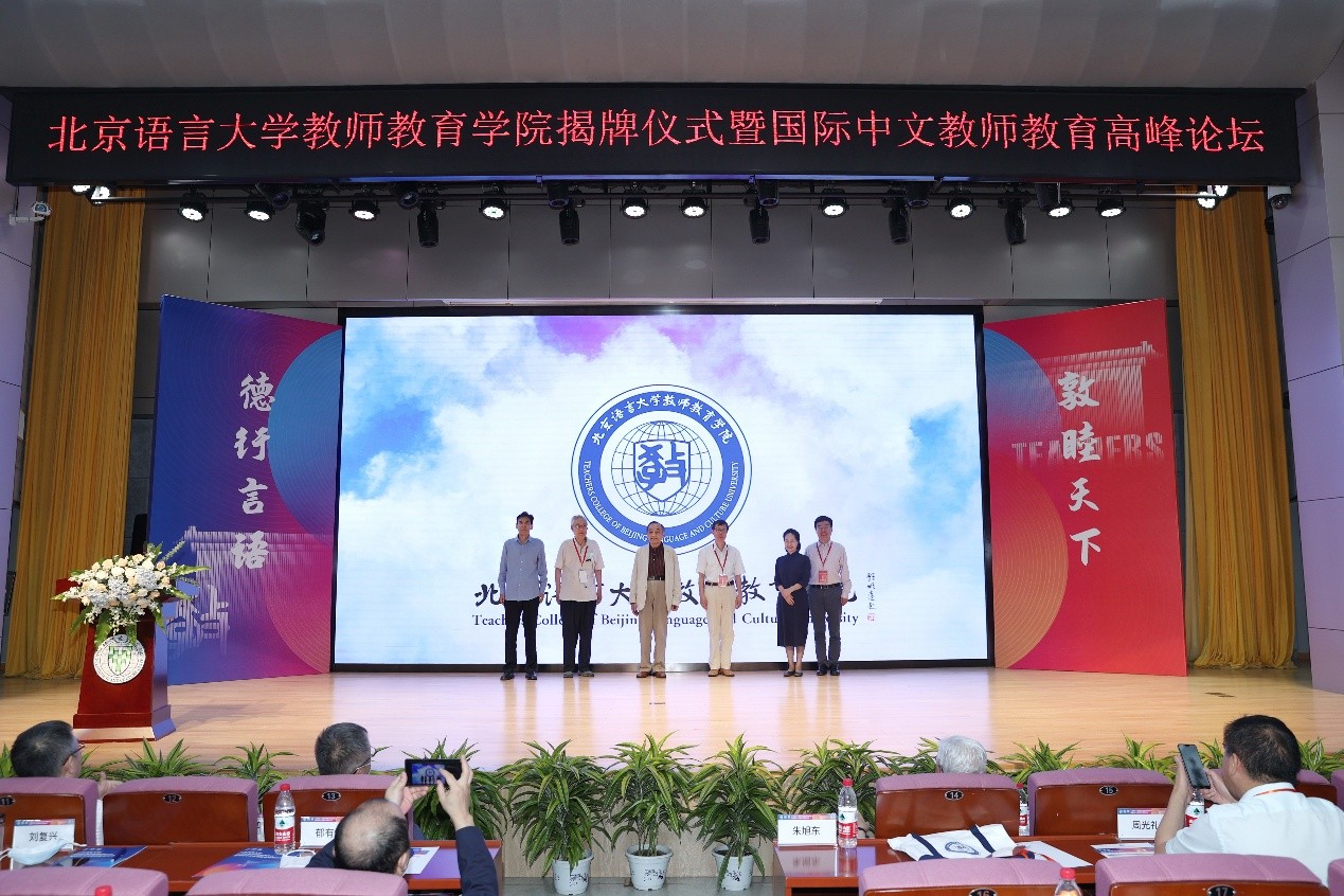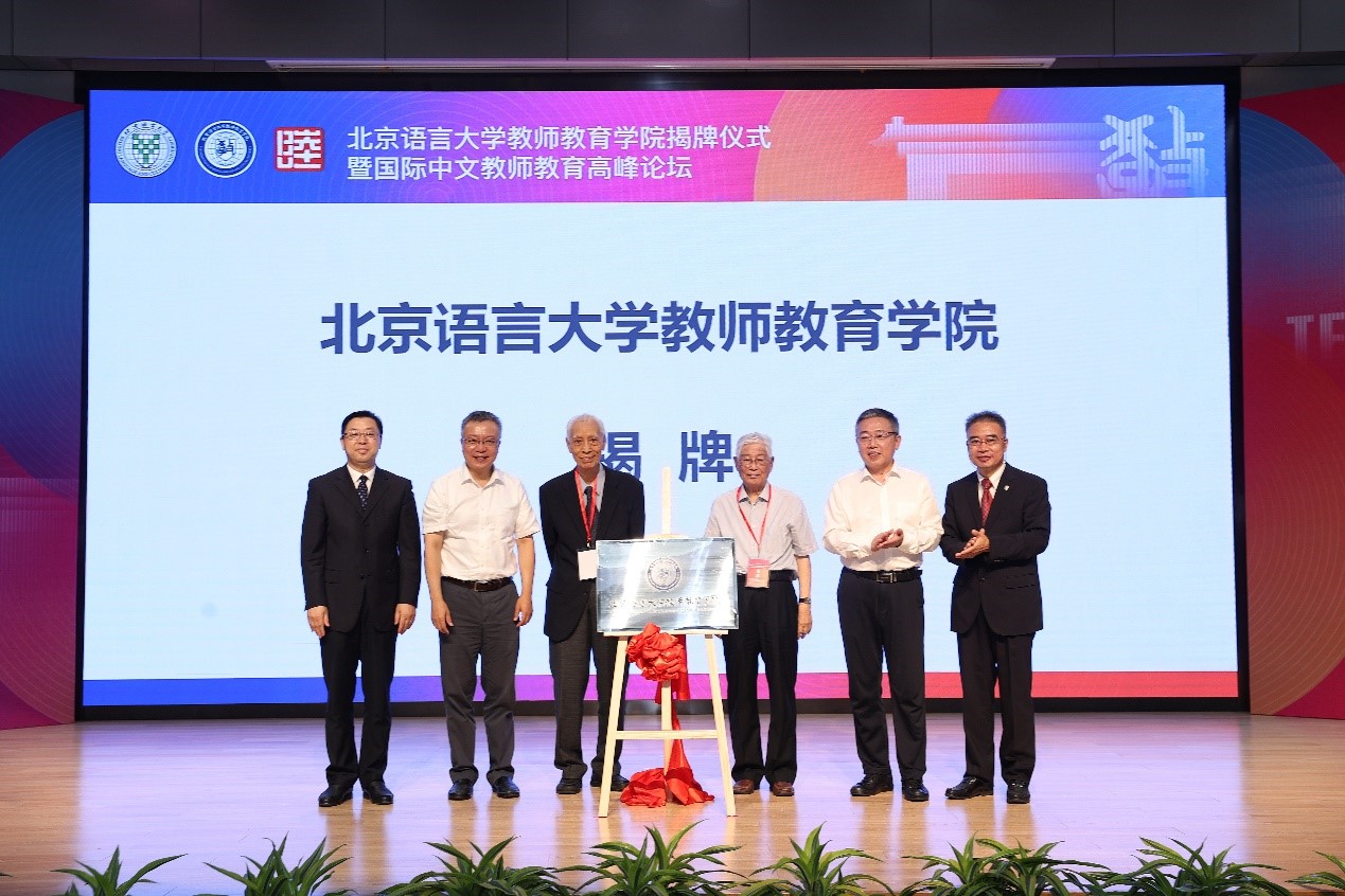 在各位领导和嘉宾的见证下,任友群司长、赵灵山秘书长、孟繁华书记、顾明远先生、陆俭明先生和刘利校长共同为北京语言大学教师教育学院隆重揭牌!
