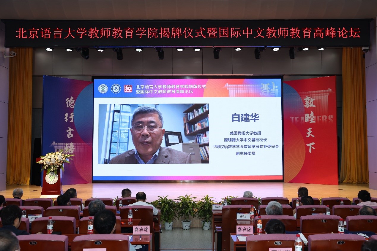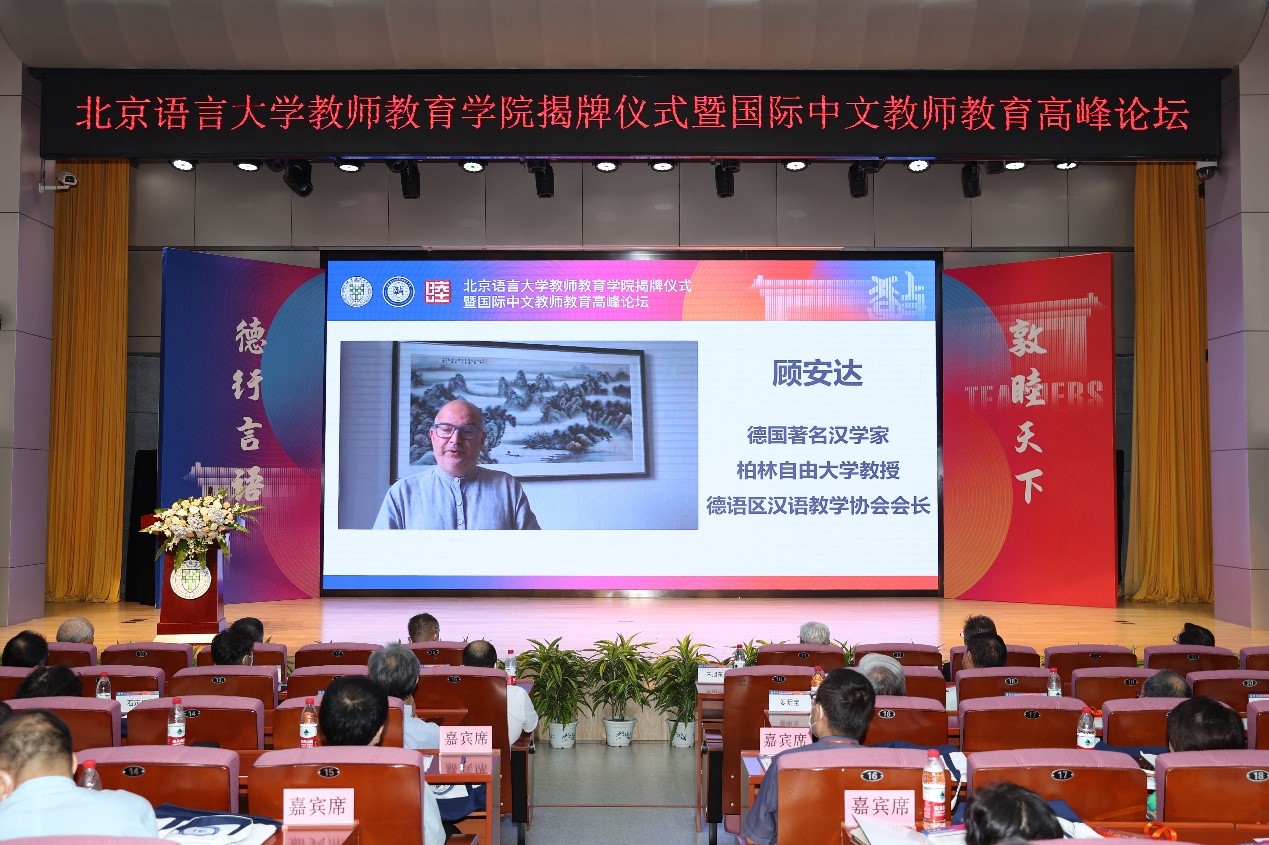 此外,美国肯扬大学教授、原明德大学中文暑校校长、世界汉语教学学会教师发展专业委员会副主任委员白建华先生,美国哥伦比亚大学教授、中文部主任、世界汉语教学学会常务理事刘乐宁先生,美国海军学院教授、原美国中文教师学会会长、美国大学理事会AP发展委员会主席、世界汉语教学学会教师发展专业委员会委员袁芳远女士,德国著名汉学家、德国美因兹大学教授柯彼德先生,德国著名汉学家、柏林自由大学教授、德语区汉语教学协会会长顾安达先生,日本大阪大学教授、世界汉语教学学会副会长古川裕先生以视频形式表达了对教师教育学院成立的祝贺。