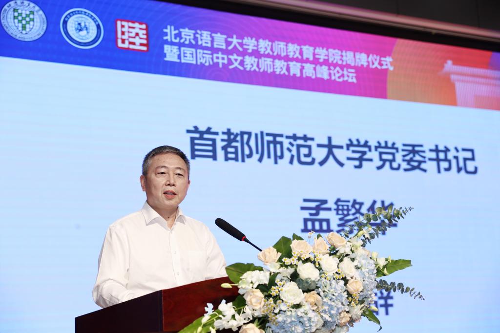 7月2日,北京语言大学教师教育学院揭牌仪式暨国际中文教师教育高峰论坛在教一楼209报告厅隆重举行,这是国际中文教育领域的国内首家教师教育学院。教育部教师工作司司长任友群,中国国际中文教育基金会副理事长兼秘书长赵灵山,首都师范大学党委书记孟繁华,教育部教师工作司教师发展处处长赵静、副处长张春柳,北京语言大学校长刘利等出席揭牌仪式。揭牌仪式由北京语言大学党委副书记魏晖主持。