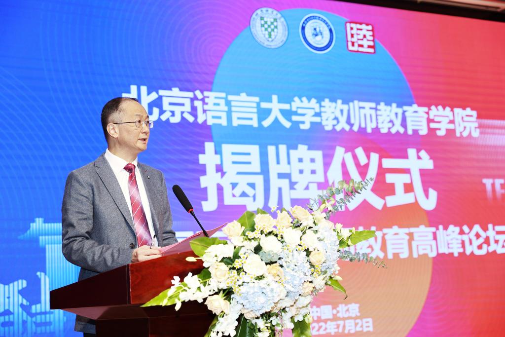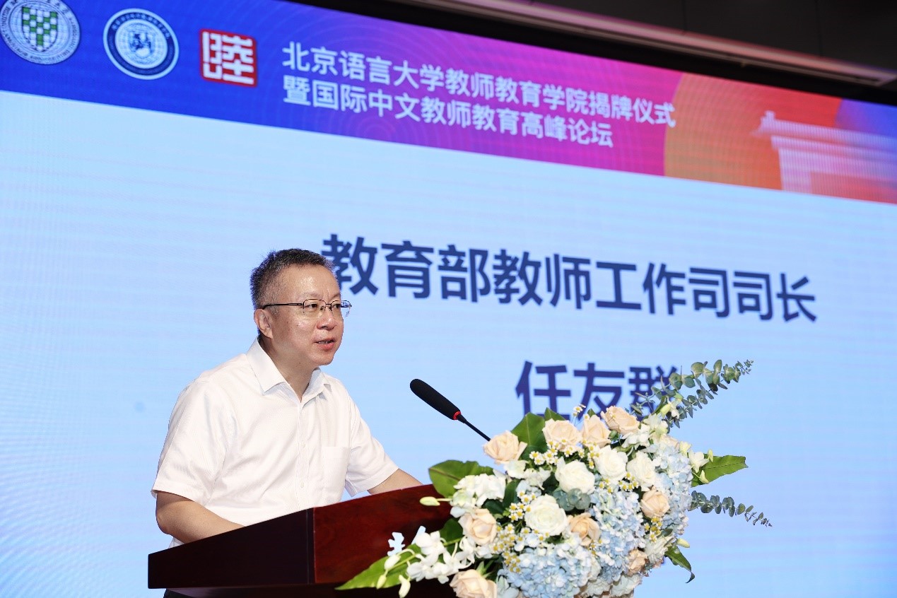任友群司长在讲话中强调,党的十八大以来,以习近平同志为核心的党中央高度重视教师队伍建设,要求从战略高度认识教师工作的极端重要性,把教师队伍建设作为基础工作来抓,并对广大教师提出殷切希望。他指出,成立教师教育学院既是北京语言大学胸怀“国之大者”的有力表现,体现了北语服务国际中文教育事业、服务教育对外开放和国家外交战略大局的主动担当;也是国际中文教育领域的又一项重大事件,必将产生深远影响。他希望北京语言大学教师教育学院能够主动担当,牢记初心使命,传承红色基因,擦亮金字招牌,面向未来,创新发展国际中文教育,培养卓越国际中文教师,深化中外人文交流,服务“一带一路”合作倡议,为中华民族的伟大复兴和构建人类命运共同体做出更大的贡献。