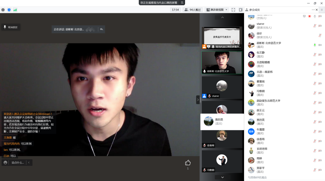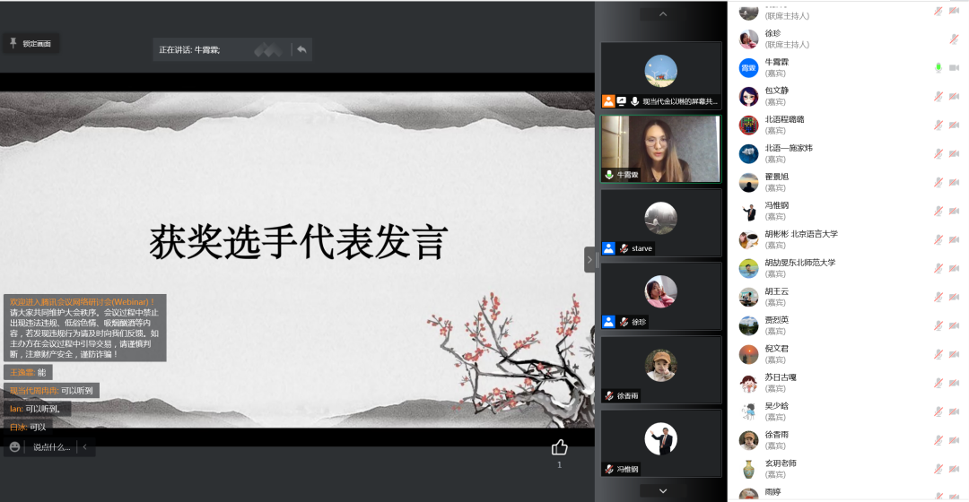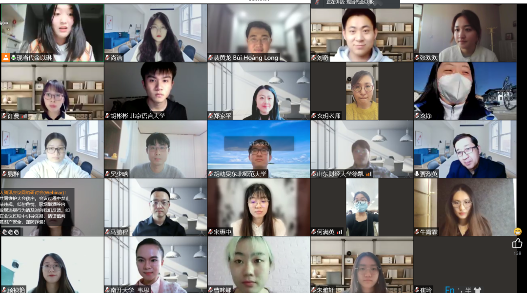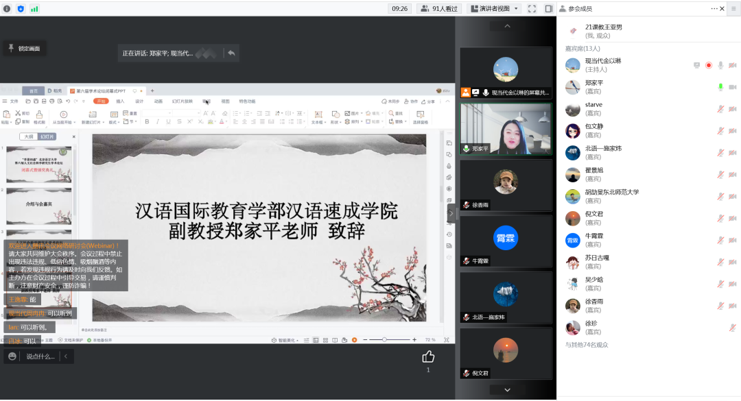 2022年4月2日下午,北京语言大学第六届人文社会科学研究生学术论坛圆满闭幕。教师教育学院院长施家炜教授,国际关系学院院长、一带一路研究院副院长贾烈英教授,教师教育学院冯惟钢副教授,教师教育学院余蓝副教授,国际关系学院王晓文副教授,汉语国际教育研究院李润生教授,汉语国际教育学部汉语速成学院郑家平副教授等出席闭幕式。
