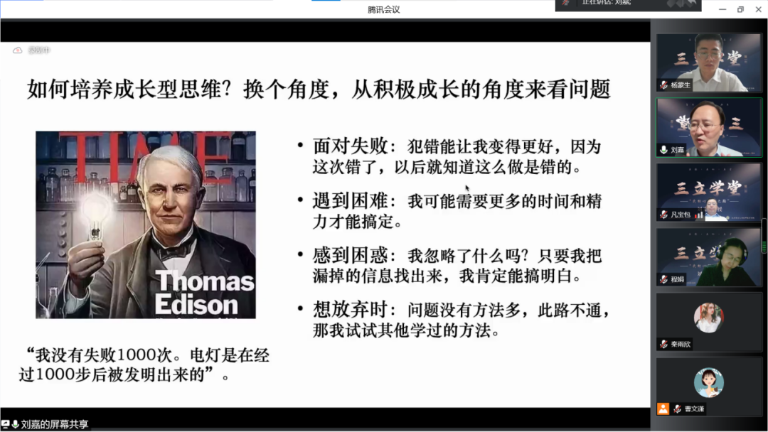 2022年5月29日晚,“三立学堂”第一期正式开讲,作为19级汉教2班指导老师的刘利校长,始终关心关注着学子们的健康成长。为提升学生们的综合素质,特地邀请清华大学刘嘉教授做三立学堂首场报告,讲述自己的心理学之路。刘利校长担任主持并致辞。国际教育管理处处长陈丽霞、心理学院常务副院长江新、文学院杨蒙生老师、教师教育学院党委书记程娟,党委副书记、院长施家炜,团委书记、研究生辅导员马铖,本科生辅导员曹文潇列席。70余名师生参会,共同聆听刘嘉教授成功背后的故事。