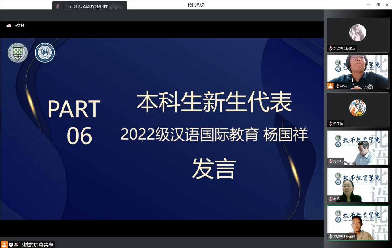 研究生老生代表2021级课程与教学专业何孟秋和本科生新生代表2022级汉语国际教育专业杨国祥先后发言。何孟秋同学重点分享了自己在北语一路成长的经历和感悟,话语中流露出对学校和学院真切的热爱;杨国祥同学则讲述了自己初来乍到的所见所闻,以及受学校和学院文化氛围的感染,所产生的使命意识。两位同学的发言感情充沛,前浪对话后浪,祝福与憧憬、初心未改与朝气蓬勃同样真诚动人。