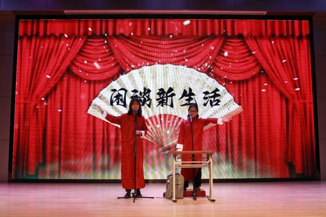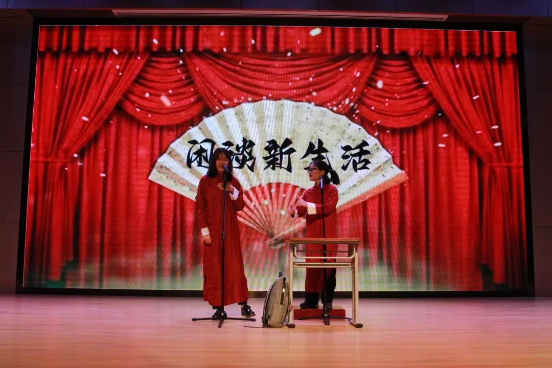 由彭丽钧、乔柏钦首先带来相声《闲谈新生活》。一袭长衫立台上,她们以诙谐的笑话,结合时代热点和学校趣事,传递正能量,妙语连珠赢得了大家的阵阵掌声,令人回味无穷。