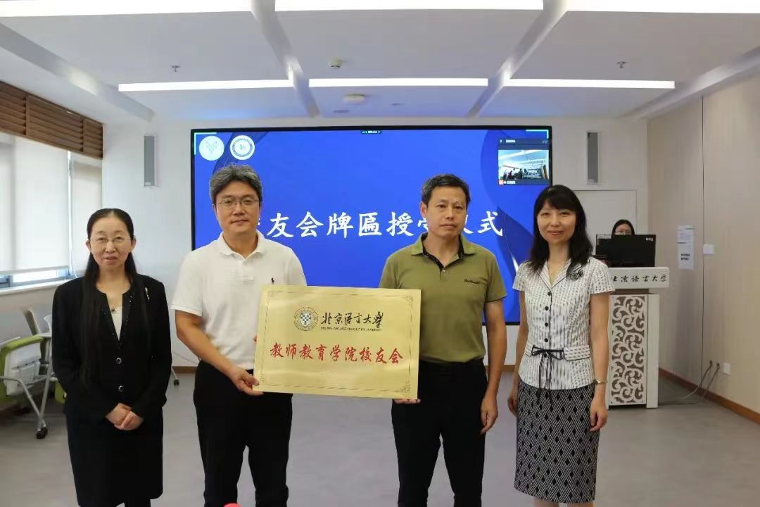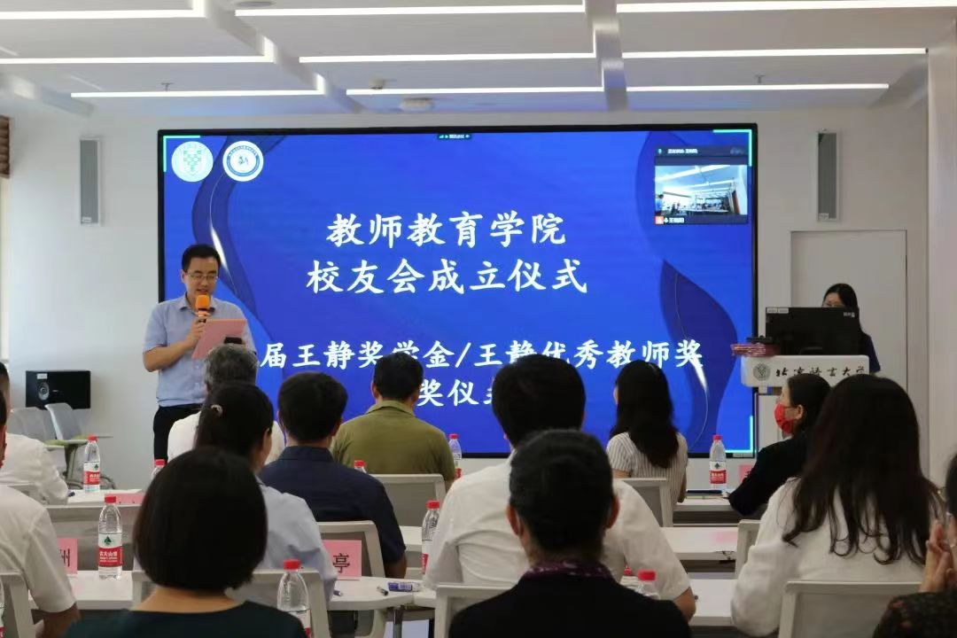 北京语言大学教师教育学院自成立后便开始筹备成立校友会,在学校领导的大力支持和校友办的热情指导下,学院组建了校友会筹备委员会,对校友会名誉会长、会长、副会长、秘书长、副秘书长人选进行了意见征询和研讨。经过精心筹备,2022年9月16日下午,教师教育学院校友会成立仪式暨首届王静优秀教师奖/王静奖学金颁奖仪式在图书馆日新讲堂举行。北京语言大学副校长、北京语言大学校友总会副会长张宝钧教授,校友工作办公室主任马小垒,教师工作部部长展明锋,学生处副处长、学生工作部副部长(主持工作)武玉洲,教育基金会副主任石鑫,北京语言大学企业家校友会会长黄小治,北京谦映像文化传媒有限公司副总经理、校友陶卫国,国合新力(北京)基金管理有限公司副总裁、校友钱军,以及部分海内外校友代表出席活动。活动先后由北京语言大学语言资源高精尖创新中心副主任、校友刘晓海,教师教育学院院长施家炜,教师教育学院党委书记程娟主持。