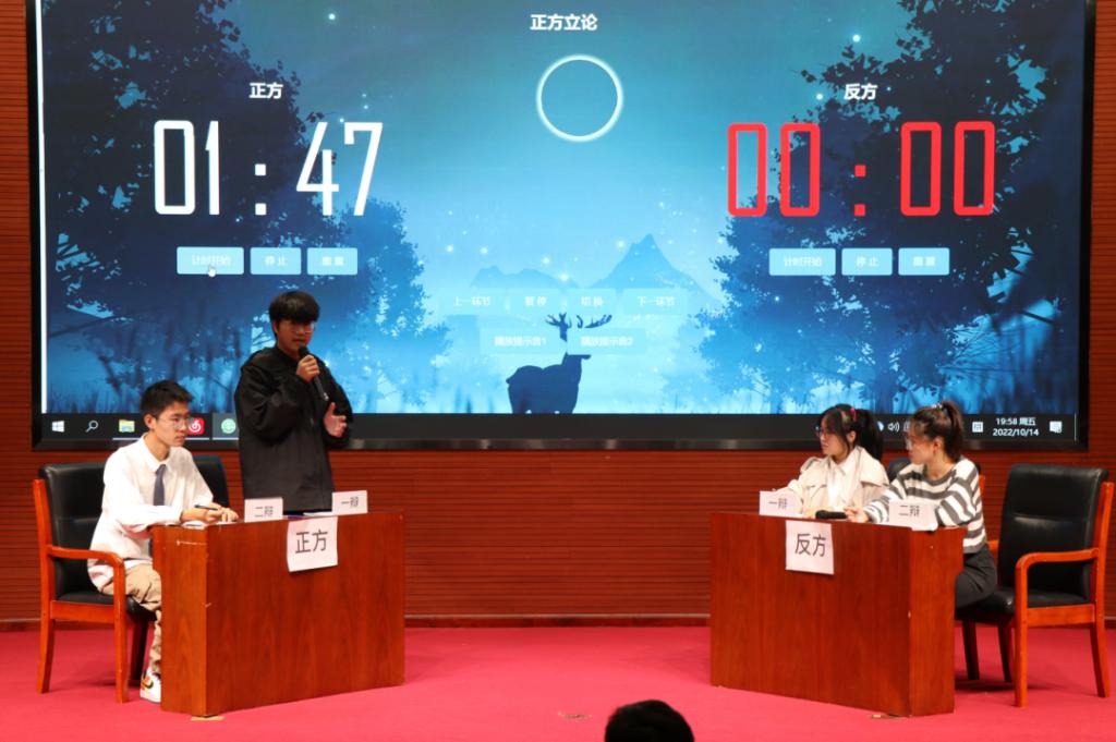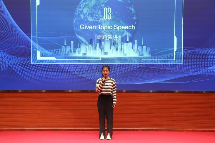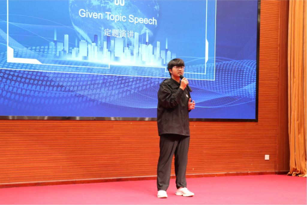 本次口语大赛决赛采取晋级制,分为两个环节,分别是定题演讲和英语辩论赛。第一个环节结束后,根据评委老师打出的分数,排名前四的选手进入第二轮辩论赛。