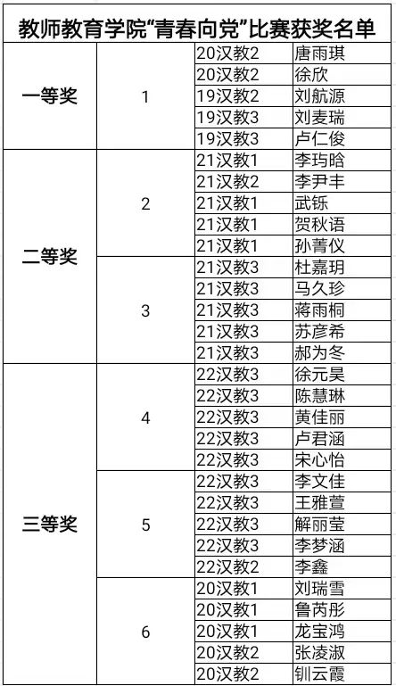 根据各组完成比赛用时,最终评定“青春向党”特色比赛获奖名单如下: