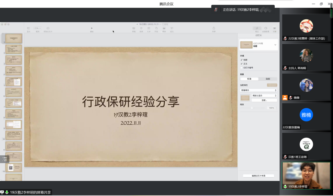 2022年11月11日,教师教育学院“职业生涯主题教育月”之保研经验交流会第二场顺利举办。李梓瑄、刘露含、尹心怡、张洁铭、周笑竹、黄可钦受邀参加本次交流会,全方位、多角度地分享了他们成功“上岸”的经验。学院团委学术发展部部长蒋雨桐主持本次会议。