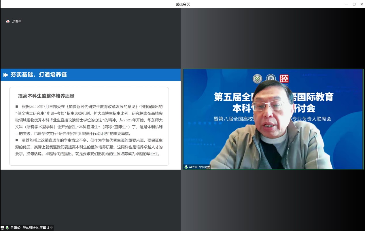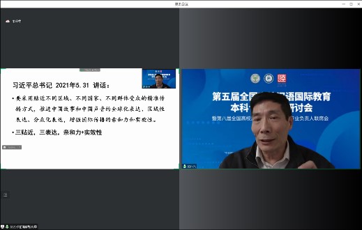 在两天的大会中,北京语言大学刘珣教授、天津外国语大学副校长余江教授、上海外国语大学国际教育学院郑瑜主任、北京语言大学教师教育学院院长施家炜教授、北京大学中文系陆俭明教授、华中师范大学国际汉语文化学院吴勇毅教授、南京大学海外教育学院张全真主任、武汉大学文学院裴亮副院长分别作了题为《新形势下国际中文教育学科体系新探》《新时代汉语国际教育专业与区域国别学:使命、目标与路径》《一流本科建设背景下汉语国际教育专业培养方案制定与实践》《拔尖、创新、交叉、融通:“中文国际传播”中国语言文学拔尖学生培养基地的北语探索》《新形势下国际中文教育的使命和中文教师应有的素质与要求》《新文科视野下的卓越人才培养》《后疫情时代汉语国际教育本科实习模式探索》《新文科背景下武汉大学汉语国际教育课程体系改革初探》的主旨报告。上海外国语大学国际教育学院院长金慧教授、华东师范大学国际汉语文化学院副院长文娟副教授,北京语言大学教师教育学院周小兵教授、郭睿教授先后担任主持人。主旨报告聚焦新形势,立足新时代,阐发新观点,积极探索当下汉语国际教育专业建设发展切实可行的路径,见地深刻、精彩纷呈,主持人妙语连珠,现场气氛热烈。