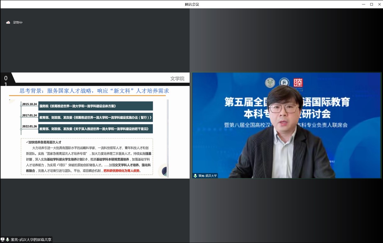教育部中外语言交流合作中心党委书记、主任马箭飞教授在讲话中强调了全国高校汉语国际教育本科专业负责人联席会一直以来对汉语国际教育本科专业建设、人才培养和学科发展发挥的重要推动作用,认为当前世界之变、时代之变、历史之变与和平发展、合作共赢的历史潮流合力强化着世界对国际中文教育专业人才的多样需求,其中包括:越来越多的国家将中文纳入国民教育体系,国际中文教育区域国别特色化发展的需求,国际中文教育数字化发展的需求,中文与专业或中文与职业的融合发展需求,以及国际传播能力建设的需求。党的二十大报告对做好新时代教育工作作出指示,为国际中文教育领域人才培养指明了方向、提供了根本遵循。马箭飞教授同时就如何进一步推动国际中文教育本科人才培养的议题,提出了加强“五化”的指导意见:一是分层次一体化,既要注意本科与硕士、博士阶段不同层次的培养需求,也要注重人才培养的衔接;二是分区域结构化,各培养院校应立足世界各国多元化、个性化的中文学习需求,推动构建多语种、跨文化的人才结构;三是分学校特色化,各培养院校应充分发挥优势、体现特色、突出重点,形成百花齐放、百家争鸣的人才培养格局;四是重应用实践化,专业基础与实践能力并重,通过国内外校际交流、实习实训等方式提升学生教学能力和综合素养;五是重合作本土化,应切实做好海外学生培养的顶层设计、科学规划,推动各国中文教育本土化内生发展。