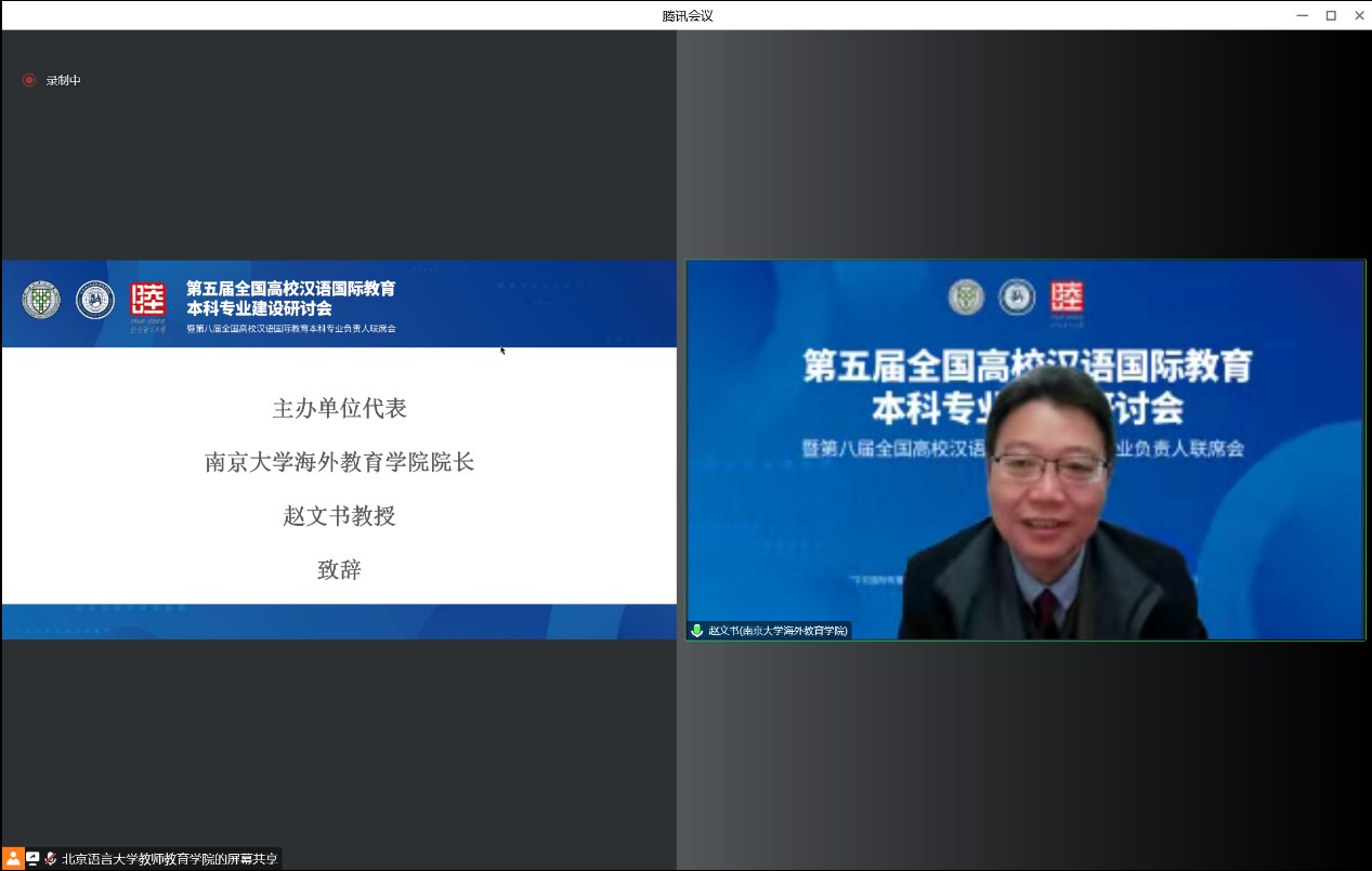 主办单位代表北京外国语大学中国语言文学学院执行院长李建盛教授、南京大学海外教育学院院长赵文书教授先后致辞。李建盛教授强调,在新冠疫情的巨大影响下,在新文科、双一流建设的背景下,有许多问题和课题仍待探讨,本届研讨会将成为国际中文教育事业再次出发的新起点。赵文书教授指出,汉语国际教育是中国话语和中国叙事体系的物质基础,而国际中文教育必然是中国特色、世界一流的学科,专业大有可为,学科大有可为。