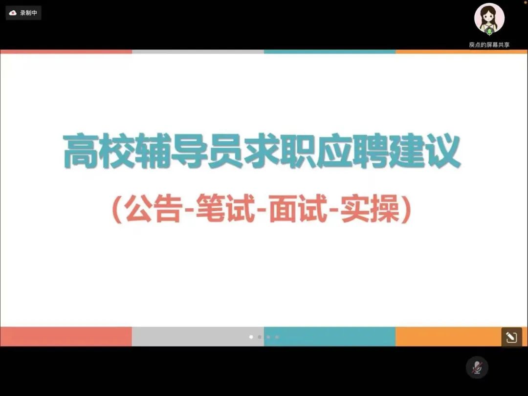 针对有高校辅导员求职意向的同学,她提出相应的应聘建议。应聘主要分为四个阶段:公告、笔试、面试和实操。前期需要根据招聘要求,有针对性地修改简历。掌握热点时政,梳理政策方针如:党的二十大精神中关于人才培养、教育发展等部分。