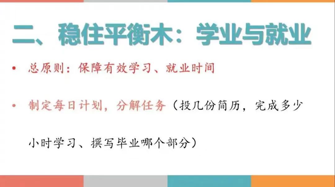 面临当前的就业压力问题,她指出,要平衡好学业与就业。总原则是要保障有效学习、就业时间。学业方面:积极联系导师,和老师保持良好沟通。就业方面:保证每日规定的学习和就业规划时间。关注网站、公众号扩宽人际资源,拓宽资源,主动应变。