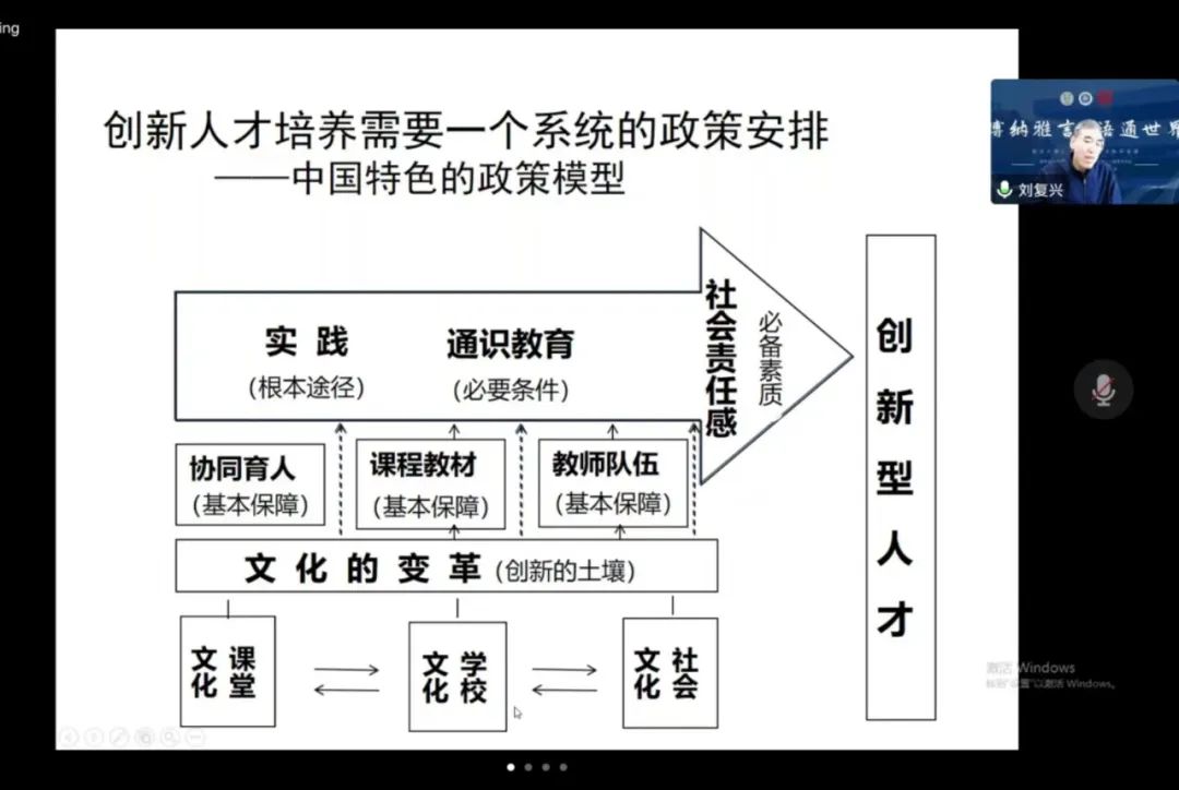 12月9日下午,由北京语言大学“中文国际传播”中国语言文学拔尖学生培养基地(国家基础学科拔尖学生培养计划2.0基地)主办的“博纳雅言,语通世界”拔尖计划2.0全国线上书院主题活动周“名师讲坛”第五讲“加快建设教育强国中的拔尖创新人才培养问题”顺利开讲。本次报告由中国人民大学刘复兴教授主讲,北京语言大学教师教育学院郭睿教授主持。