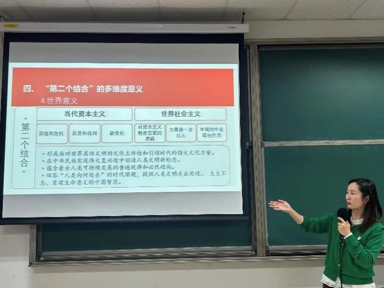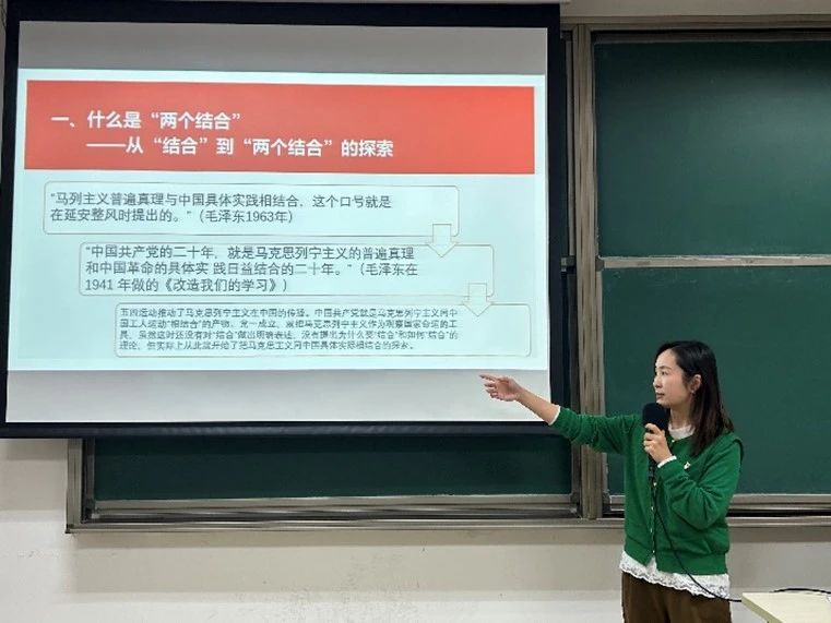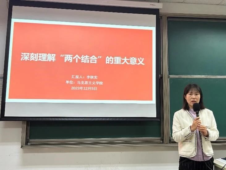 李秋实老师以“深刻理解‘两个结合’的重大意义”为主题开展讲座,带领同学们从《高举中国特色社会主义伟大旗帜为全面建设社会主义现代化国家而团结奋斗——在中国共产党第二十次全国代表大会上的报告》以及《在文化传承发展座谈会上的讲话》两部文献入手,重点强调了党的二十大报告的重要性,解释了中国式现代化的本质要求重点在于创造人类文明新形态的伟大目标,指出了马克思主义作为指导思想的重要地位。对于“同中国具体实际相结合,同中华优秀传统文化相结合”这一重要命题,她首先解读了“什么是‘两个结合’”,随后通过例举鸦片战争以来中国传统文化受到冲击的具体史实,深刻解答了重建文化自信的重要意义,重点回答了“为什么进行‘第二个结合’”;而对于“怎样进行‘第二个结合’”,她又通过马克思主义与中华优秀传统文化相契合的两个例子,指引我们关注内在的、有机的结合;随后从历史、理论、实践三个维度,以及世界意义方面剖析了“第二个结合”的多维度意义。最后,她引用习近平总书记的讲话,勉励和鼓舞同学们“担当使命、奋发有为,共同努力创造属于我们这个时代的新文化,建设中华民族现代文明!”