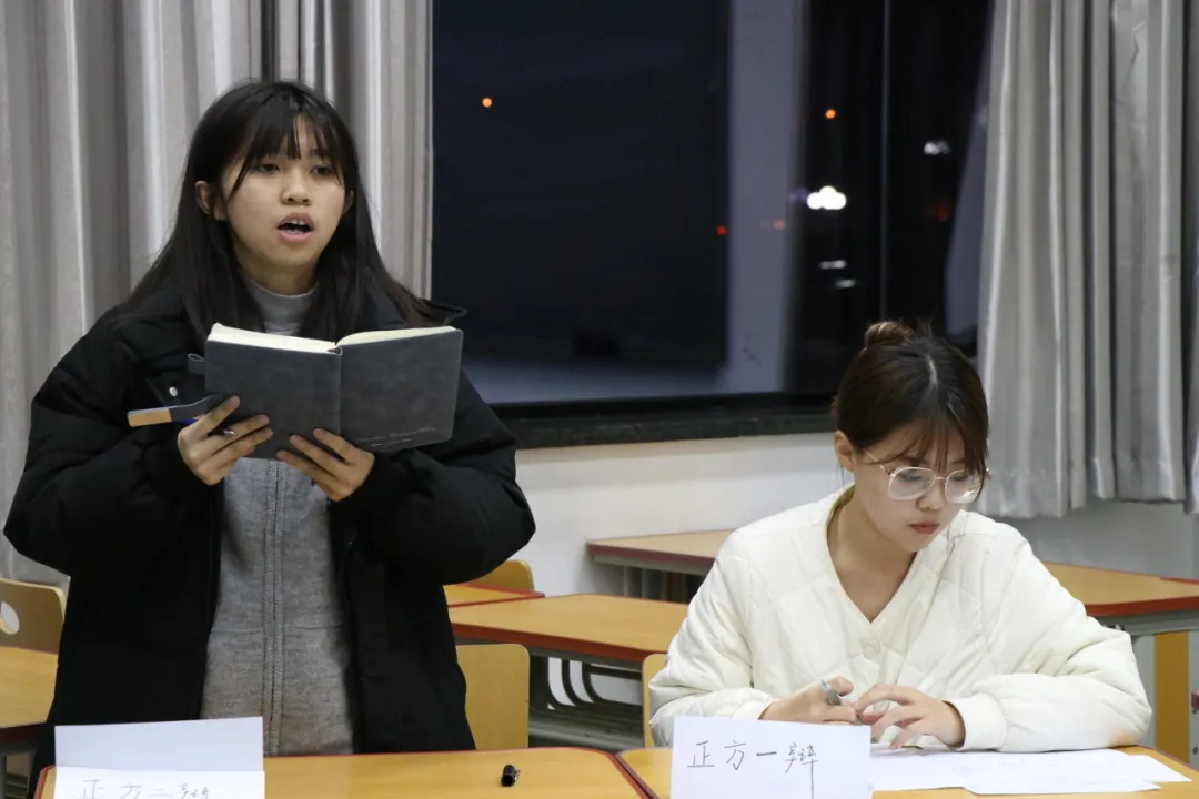本次辩论赛共四组选手参赛,采取二对二团队辩论的形式,每组选手各围绕一个辩题进行正反辩论,设置开篇立论、驳论、自由辩论、总结陈词和评委提问五个环节,最终按照选手个人评分高低选取前六名同学晋级,推选参加校赛。